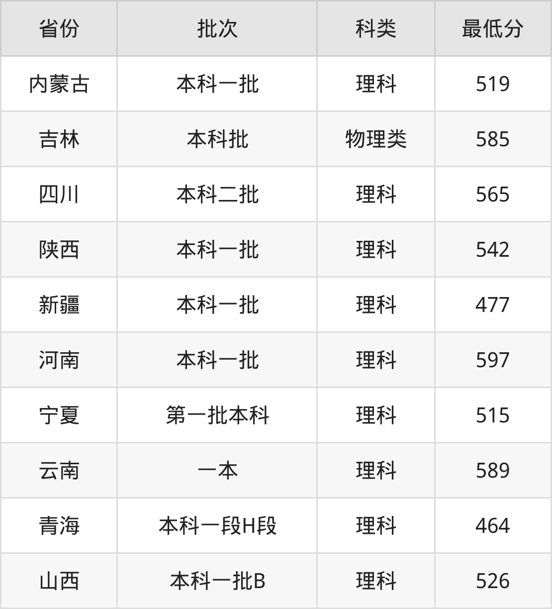 | 批次 | 科类 | 最低分 | 位次 |
