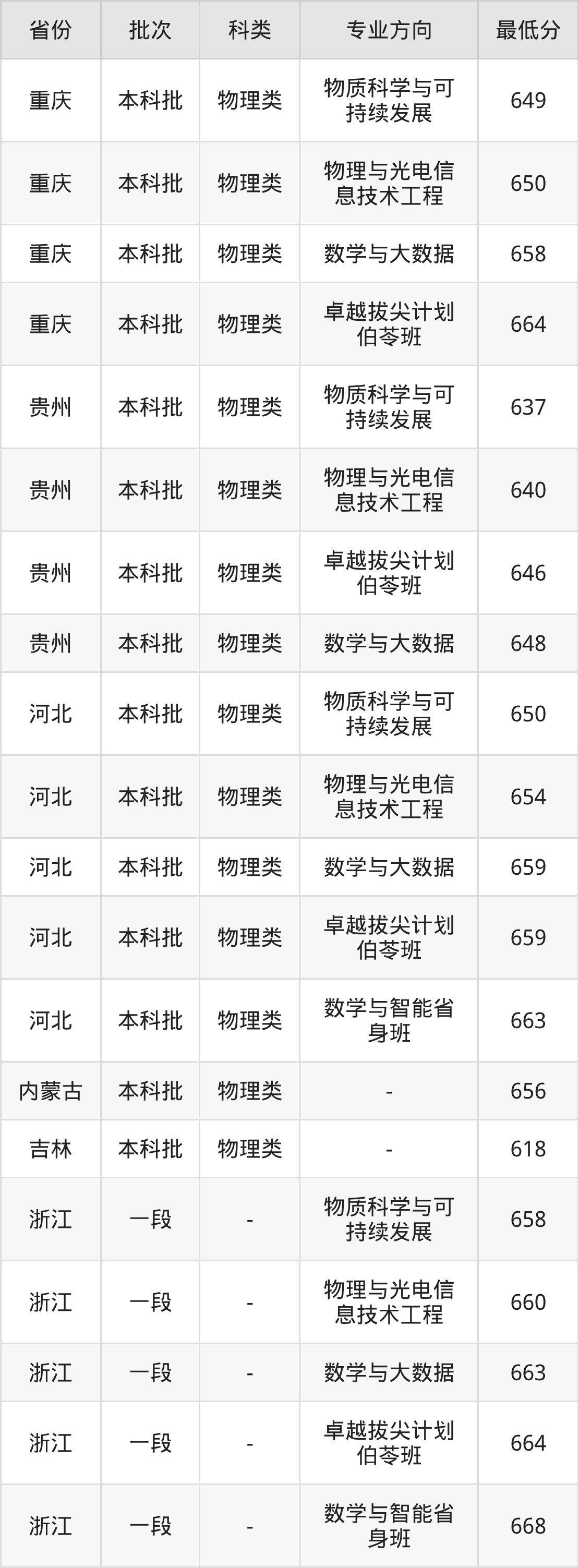 物理类649分(物质科学与可持续发展、位次1803名),物理类650分(物理与光电信息技术工程、位次1701名),物理类658分(数学与大数据、位次1099名),物理类664分(卓越拔尖计划伯苓班、位次740名)。