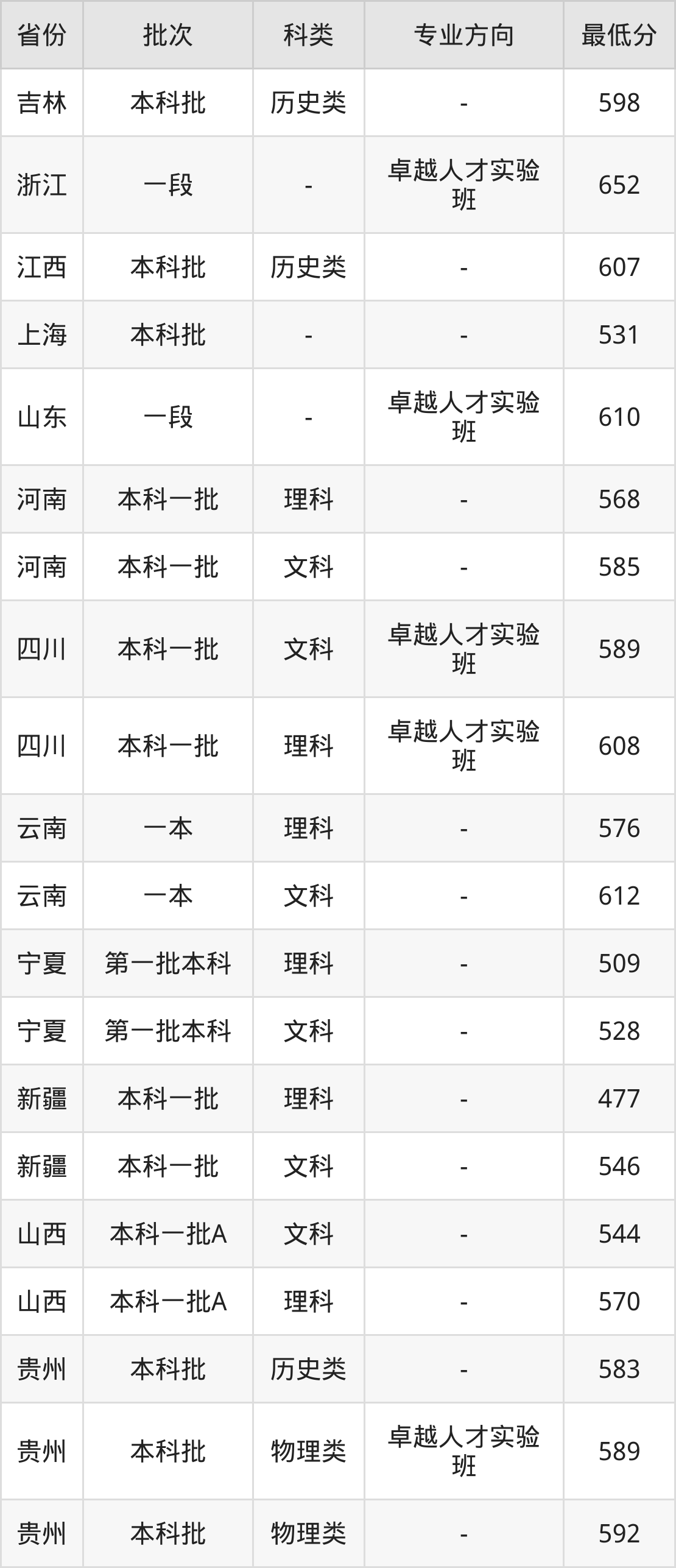 历史类583分(位次3159名),物理类589分(卓越人才实验班、位次11444名),物理类592分(位次10698名),历史类602分(卓越人才实验班、位次1681名);