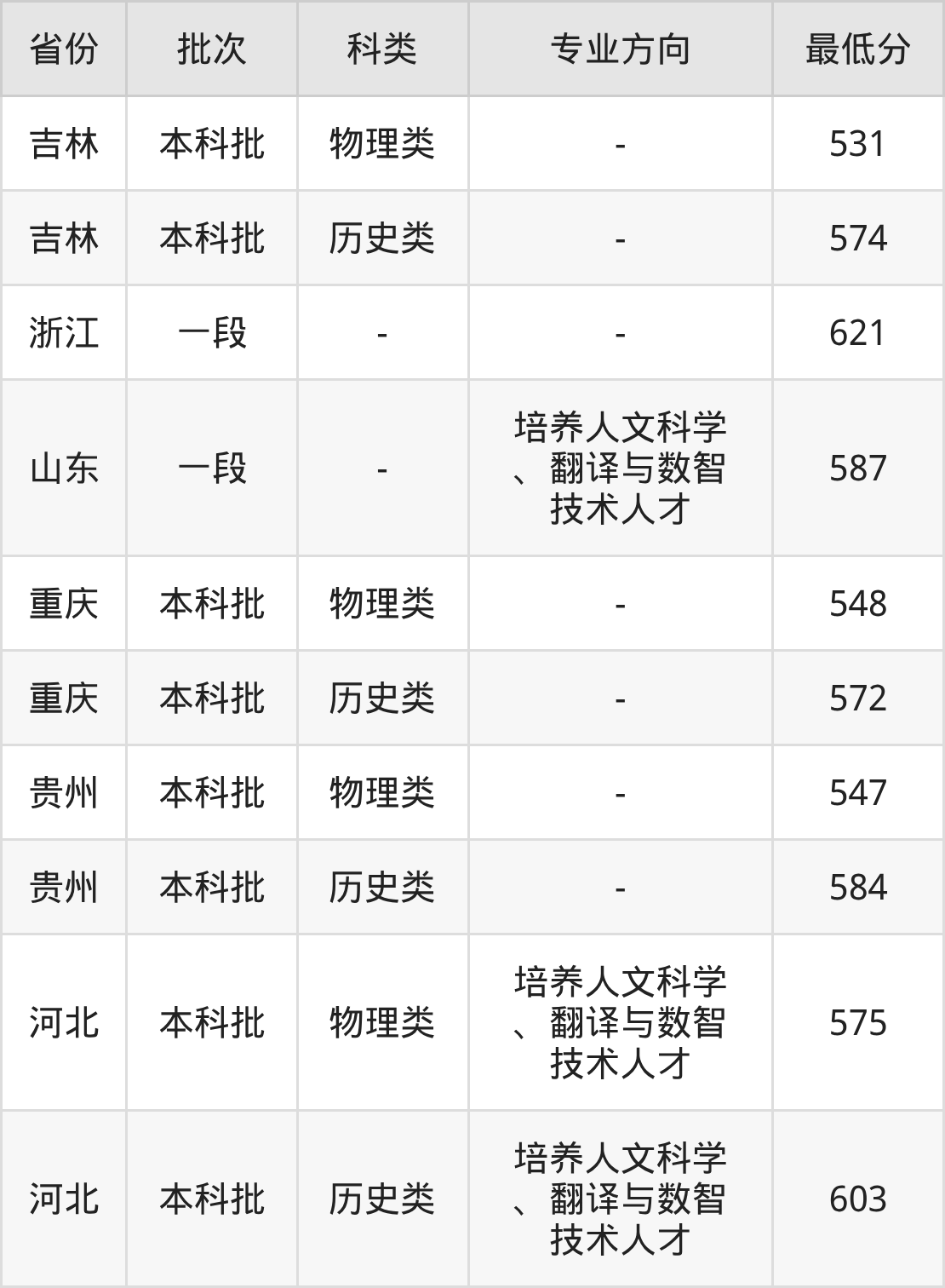 物理类575分(培养人文科学、翻译与数智技术人才、位次50224名),历史类603分(培养人文科学、翻译与数智技术人才、位次5338名);