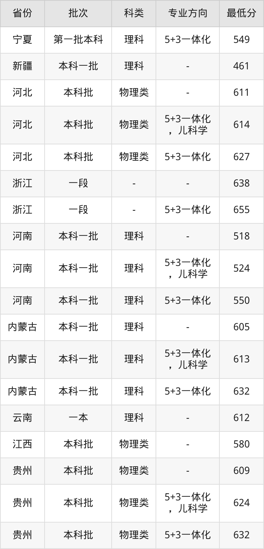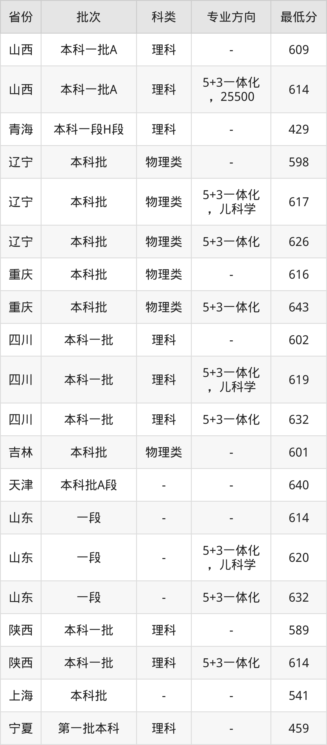 理科605分(位次3734名),理科613分(5+3一体化,儿科学、位次3004名),理科632分(5+3一体化、位次1655名)。