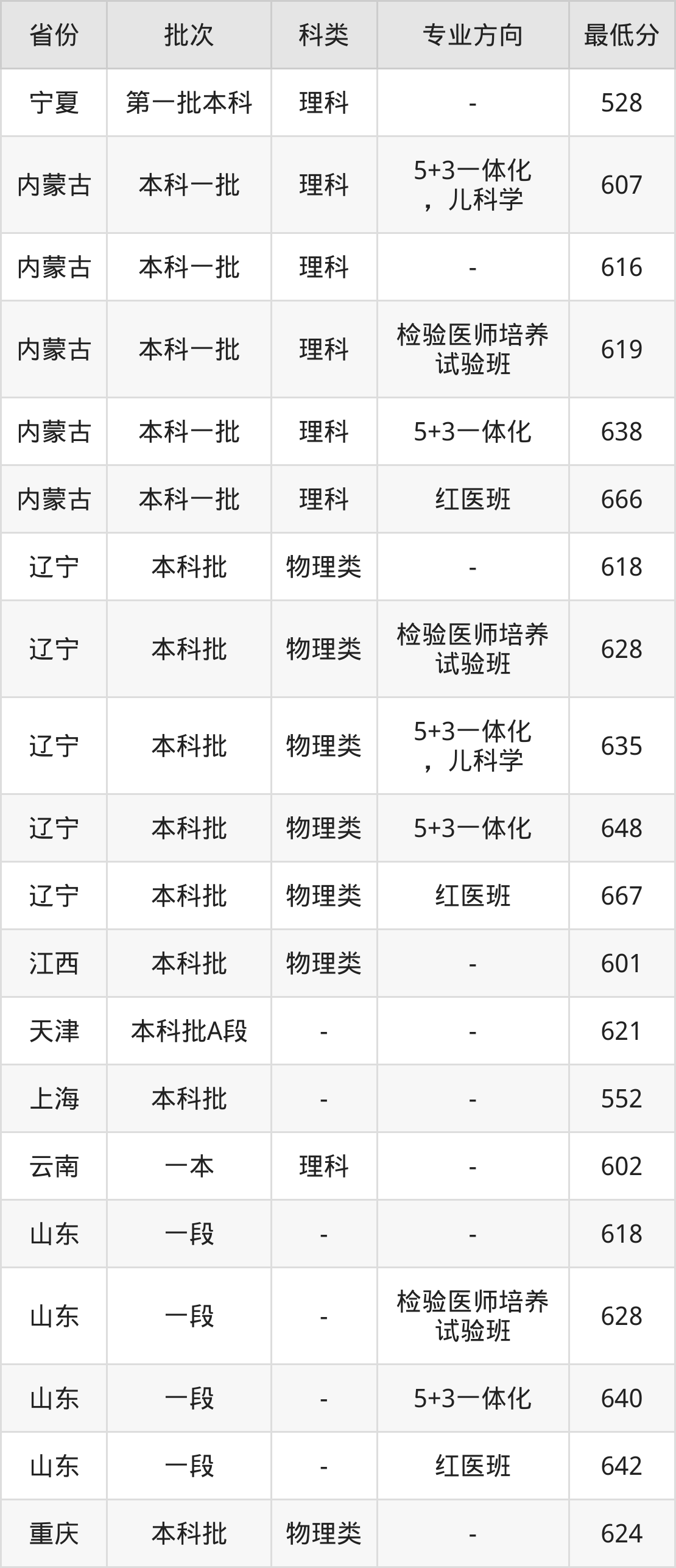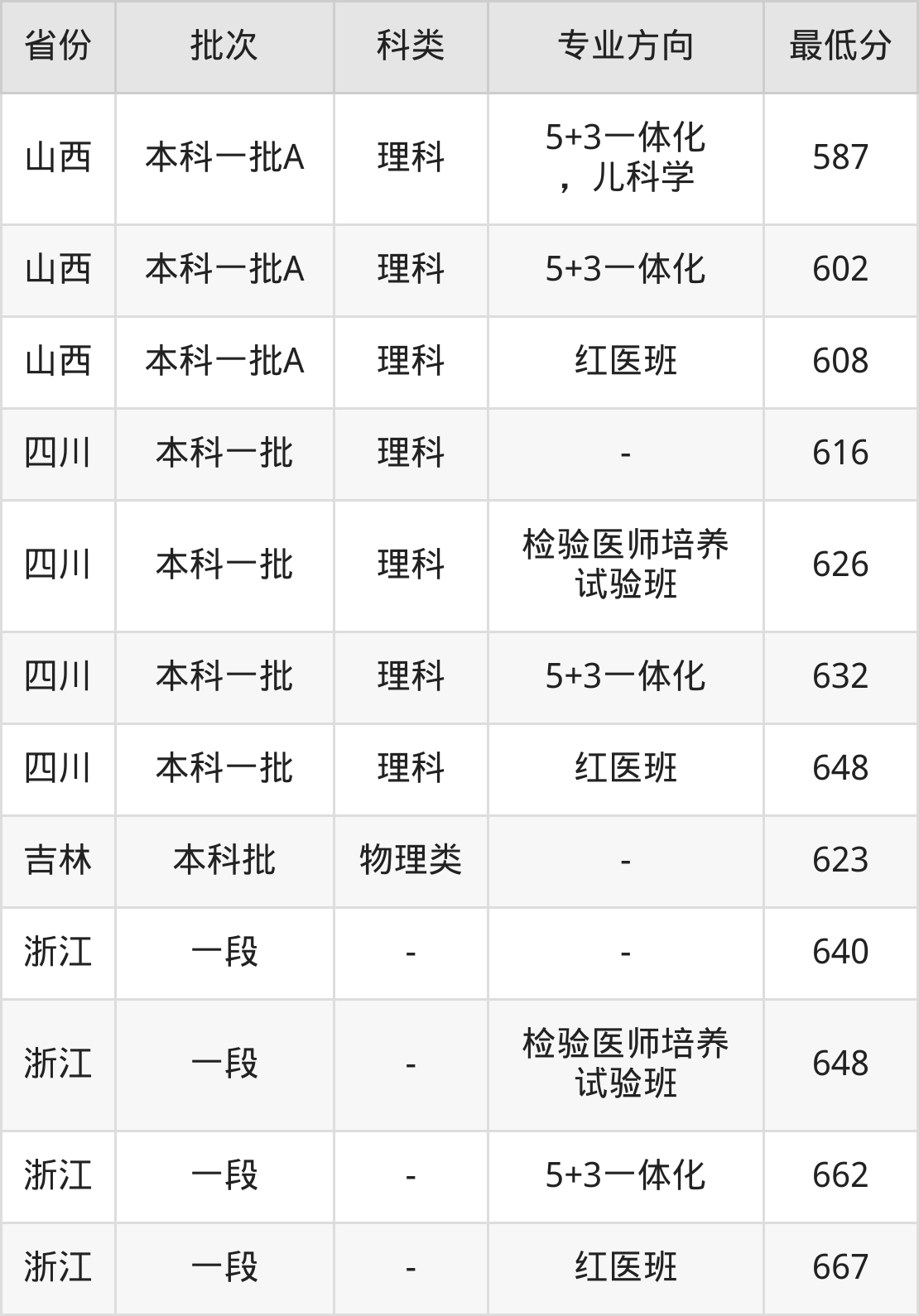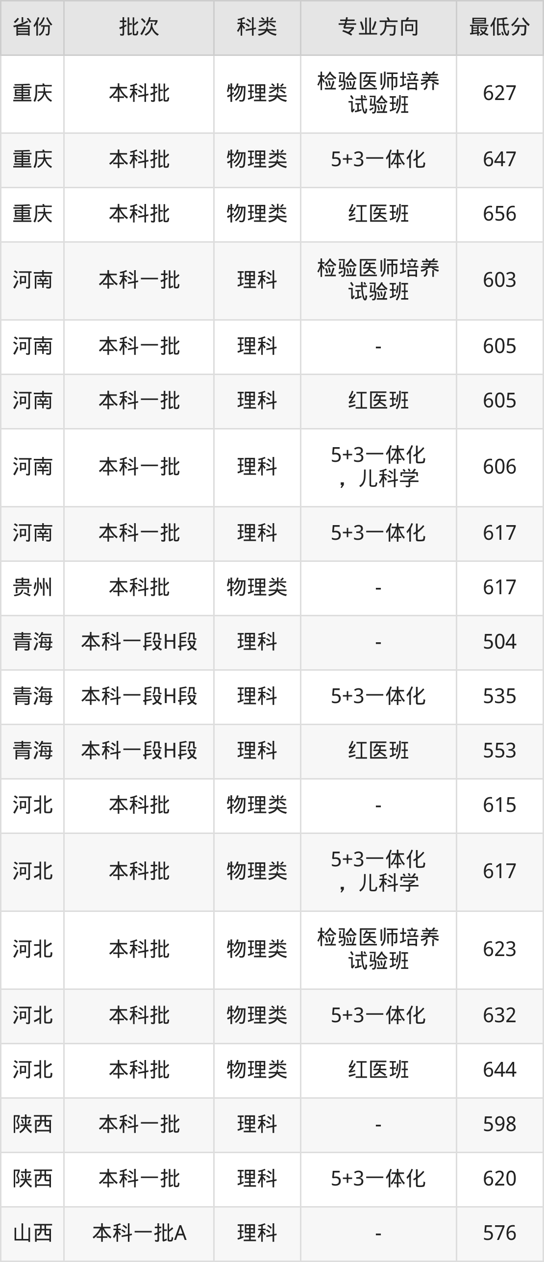 理科616分(位次17064名),理科626分(检验医师培养试验班、位次12394名),理科632分(5+3一体化、位次10024名),理科648分(红医班、位次5211名);