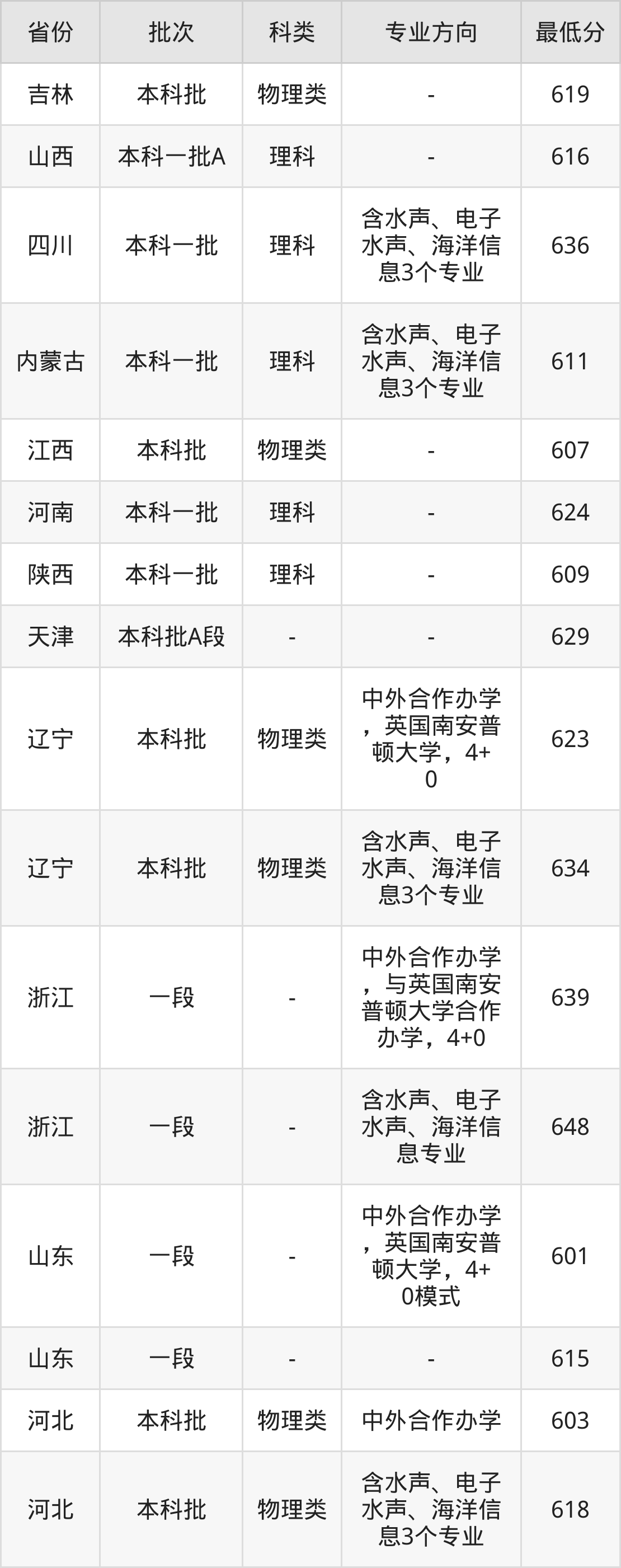 639分(中外合作办学,与英国南安普顿大学合作办学,4+0、位次19010名),648分(含水声、电子水声、海洋信息专业、位次13494名);