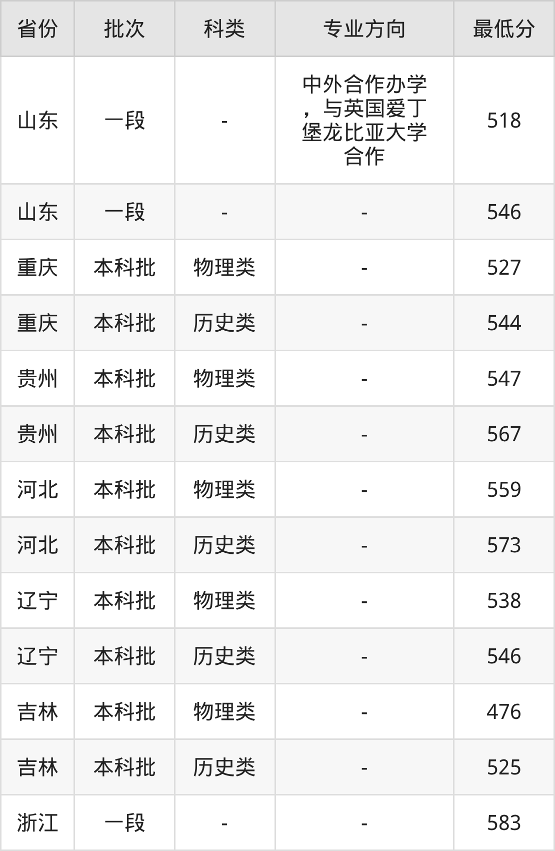 518分(中外合作办学,与英国爱丁堡龙比亚大学合作、位次143834名),546分(位次89025名);
