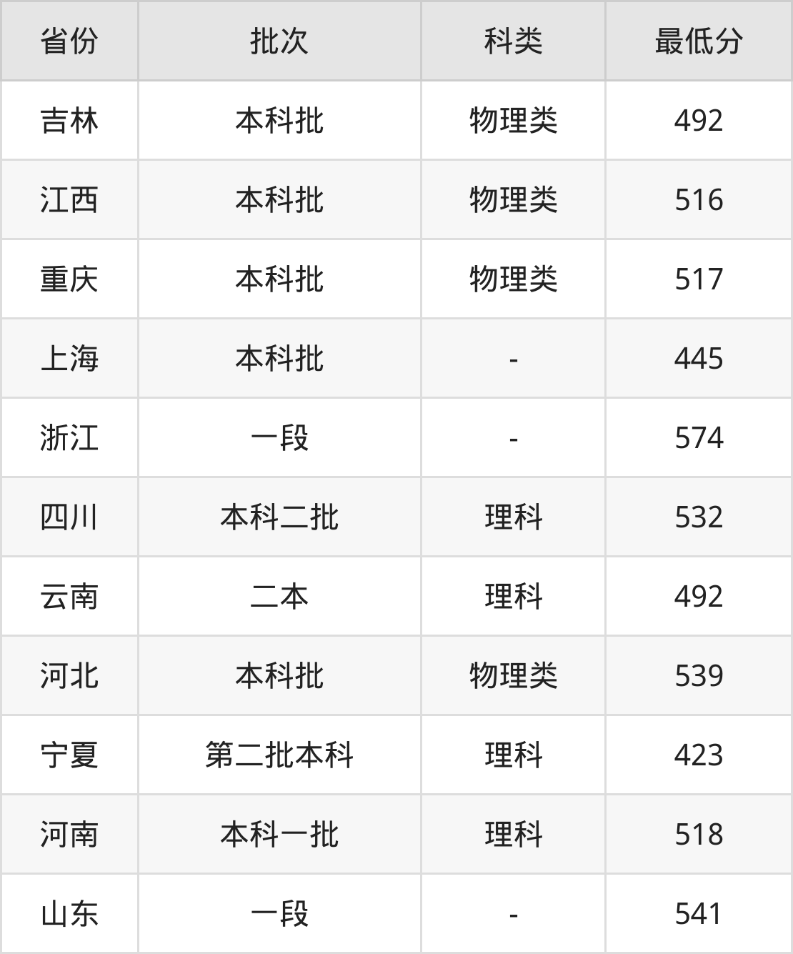 | 批次 | 科类 | 最低分 | 位次 |