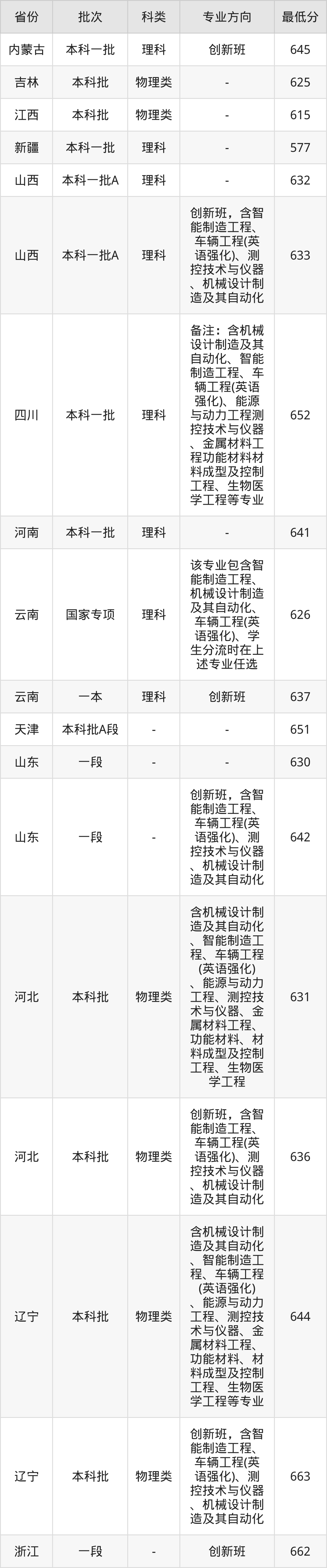 | 本科批 | 物理类 | 创新班,含智 能制造工程、 车辆工程(英 语强化)、测 控技术与仪器 、机械设计制 造及其自动化 | 663 | 1986 |