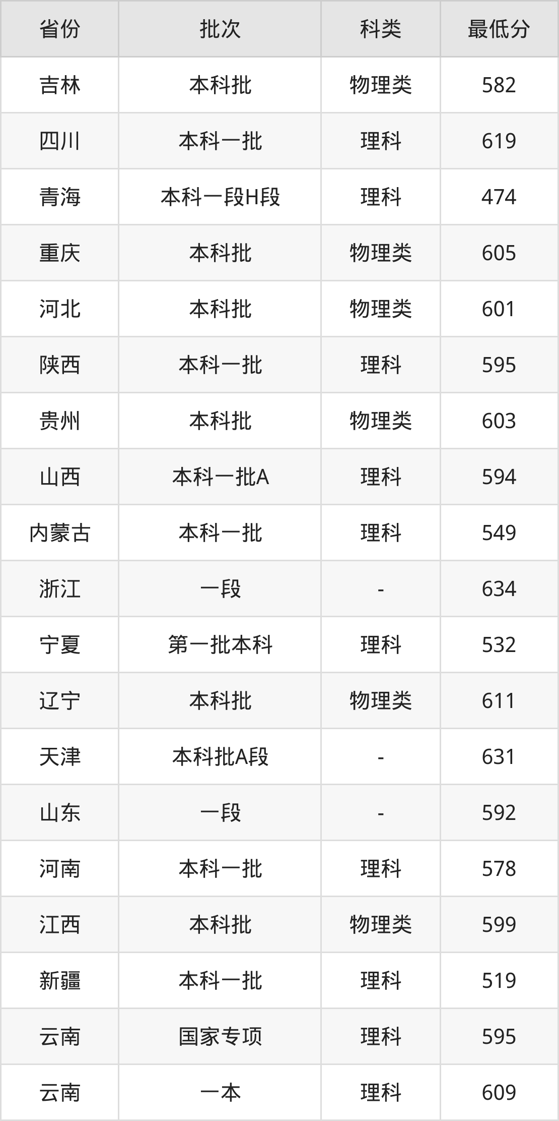 | 批次 | 科类 | 最低分 | 位次 |
