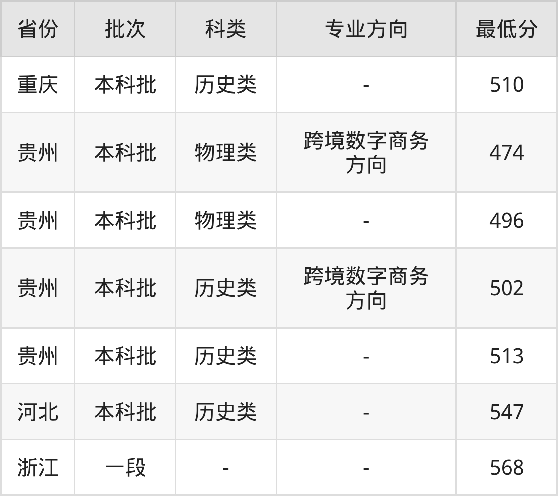物理类474分(跨境数字商务方向、位次73207名),物理类496分(位次54888名),历史类502分(跨境数字商务方向、位次21044名),历史类513分(位次17474名);