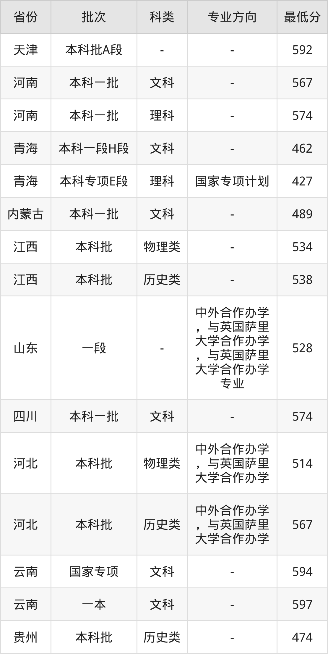 物理类514分(中外合作办学,与英国萨里大学合作办学、位次101439名),历史类567分(中外合作办学,与英国萨里大学合作办学、位次11077名);