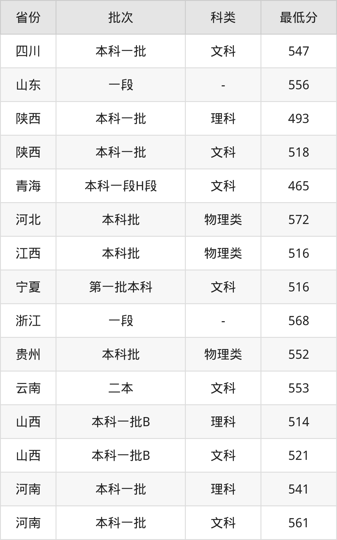 | 批次 | 科类 | 最低分 | 位次 |