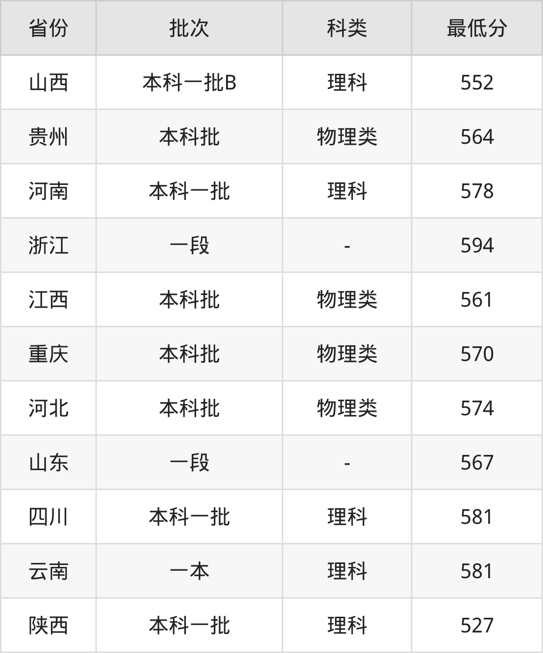 | 批次 | 科类 | 最低分 | 位次 |