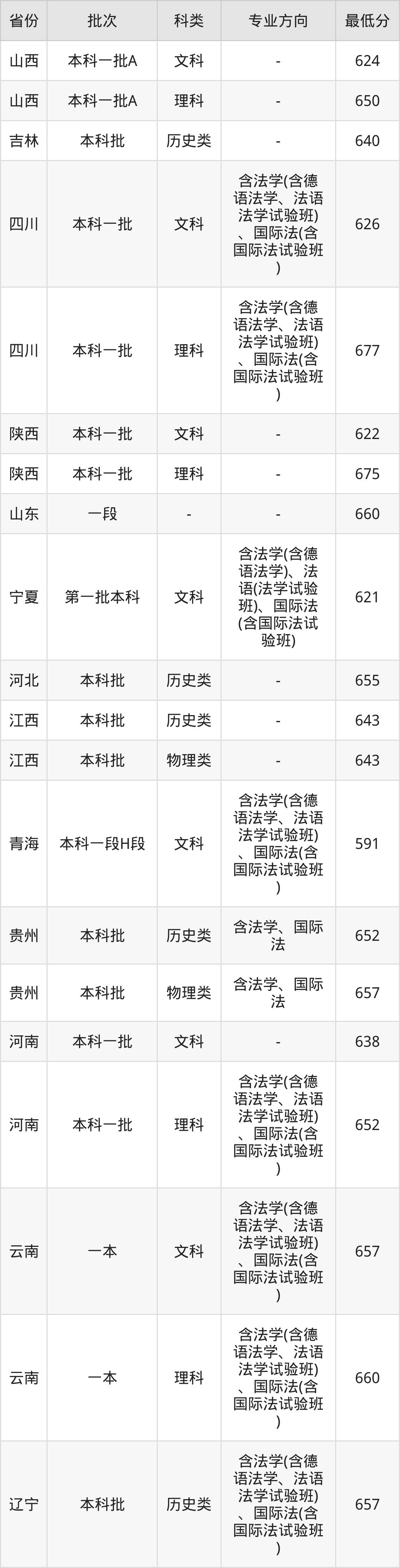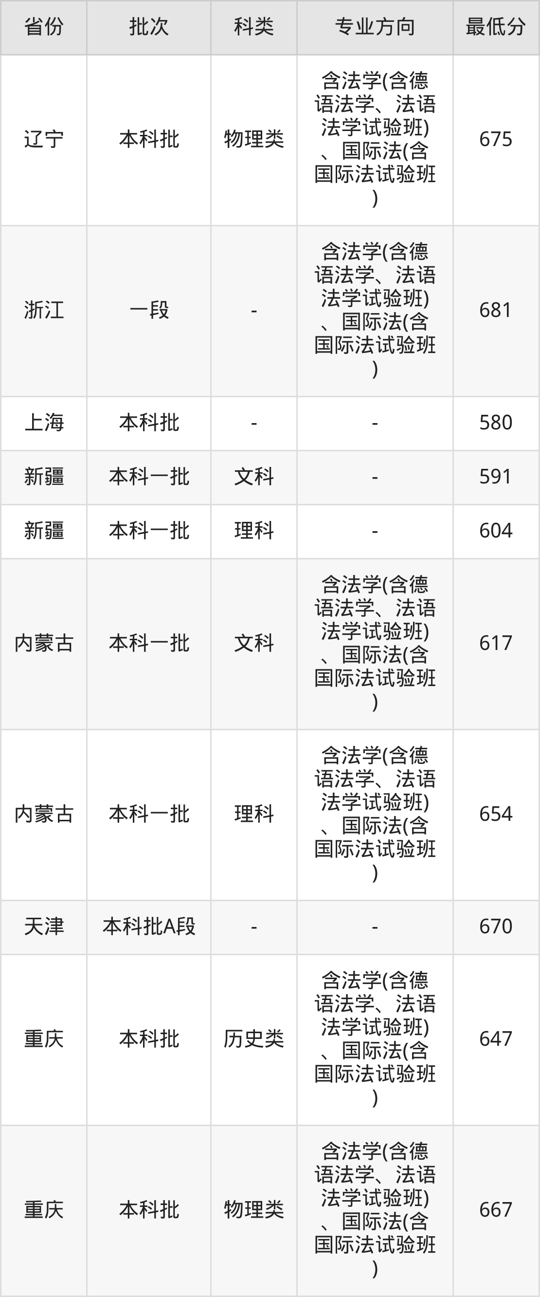 历史类647分(含法学(含德语法学、法语法学试验班)、国际法(含国际法试验班)、位次159名),物理类667分(含法学(含德语法学、法语法学试验班)、国际法(含国际法试验班)、位次956名);