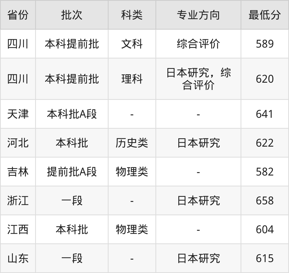 北京外国语大学日语专业录取分数线2024各省汇总显示,市外招生最低分为天津641分、河北622分、吉林582分、浙江658分等。更多专业分数详情、选科要求、专业简介等均可在正文查阅。