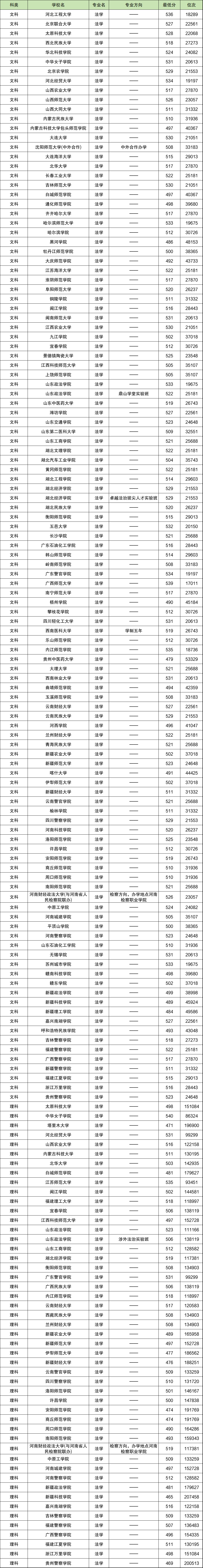 最低分的二本法学专业大学是大庆师范学院、新疆科技学院,录取分数线500分,位次135858名。