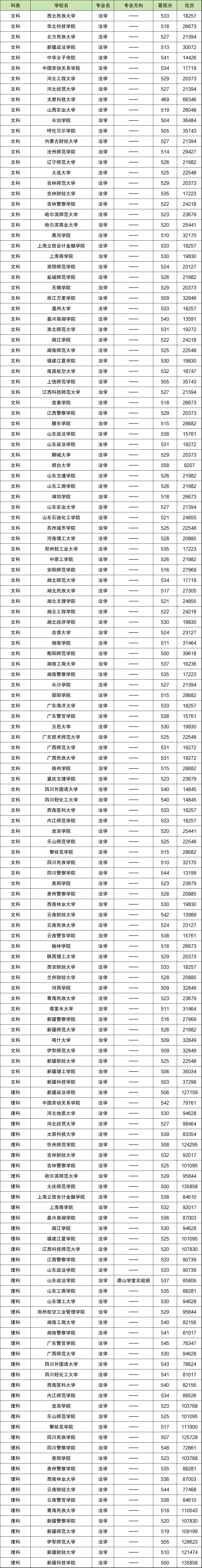 最低分的二本法学专业大学是新疆科技学院,录取分数线465分,位次207458名。
