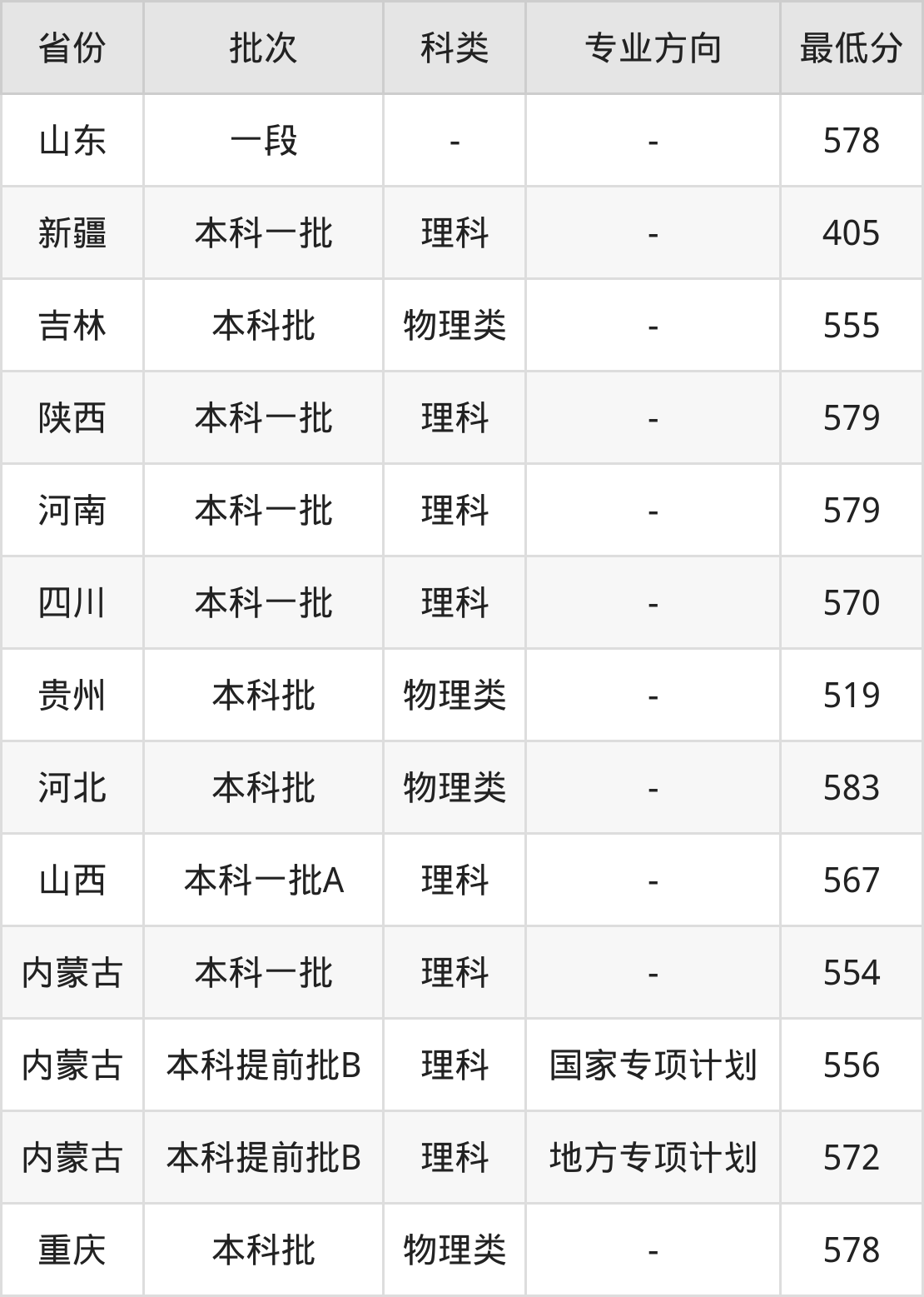 | 批次 | 科类 | 专业方向 | 最低分 | 位次 |