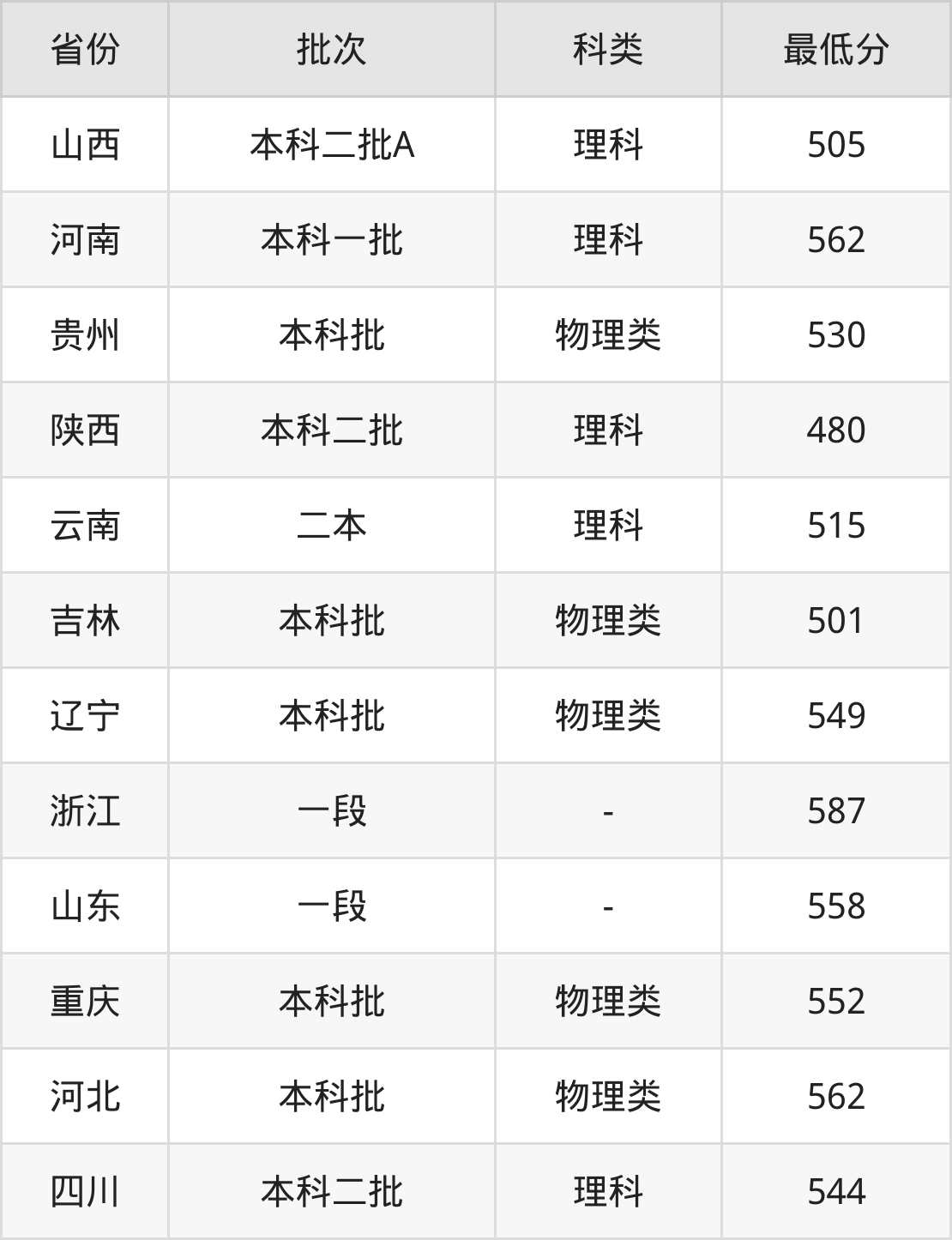 | 批次 | 科类 | 最低分 | 位次 |