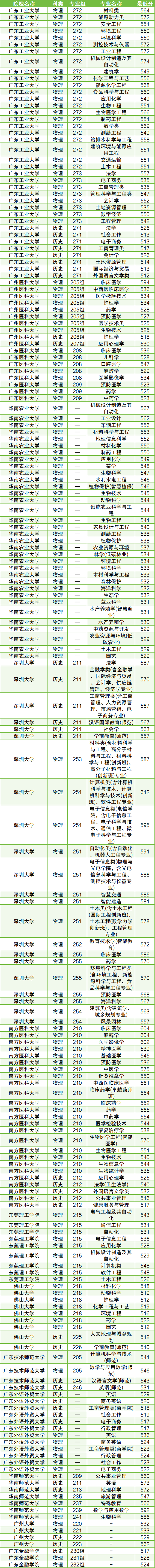 其中分数在520分以下的考生可以考虑报考:佛山大学(学前教育专业)、广东外语外贸大学(电子商务专业)、广东工业大学(外国语言文学类专业)、南方医科大学(公共事业管理专业等)等。