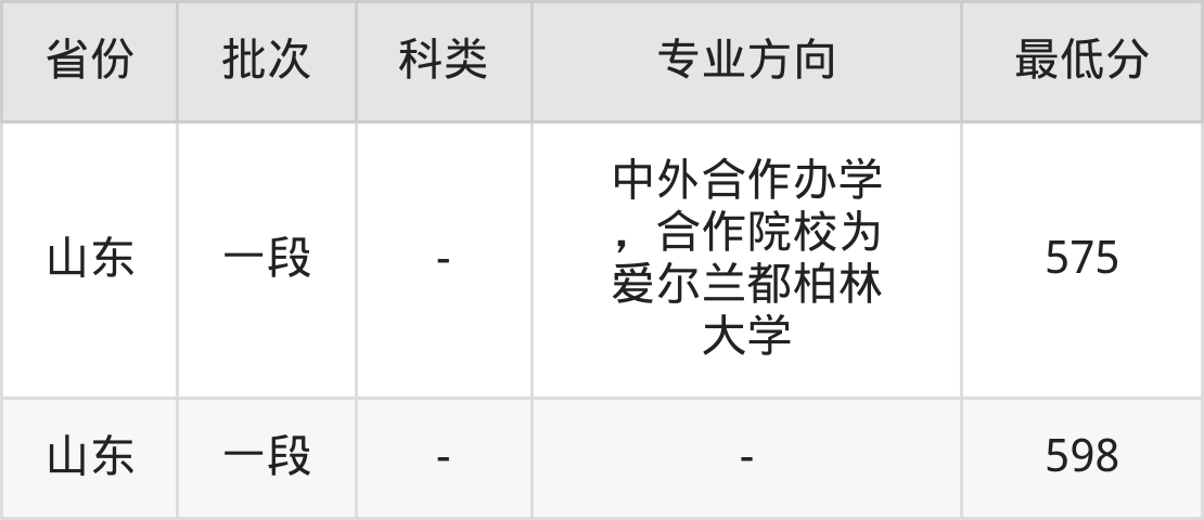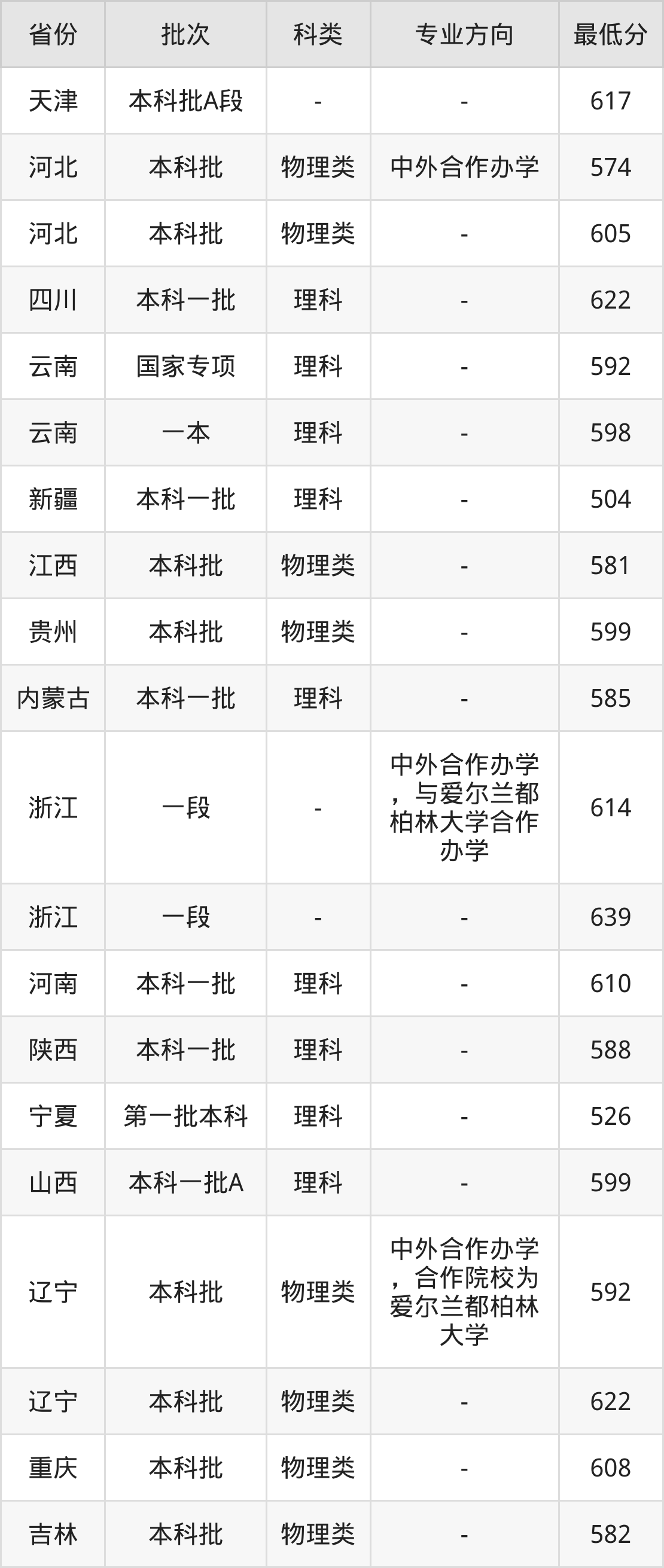 575分(中外合作办学,合作院校为爱尔兰都柏林大学、位次43121名),598分(位次23355名);
