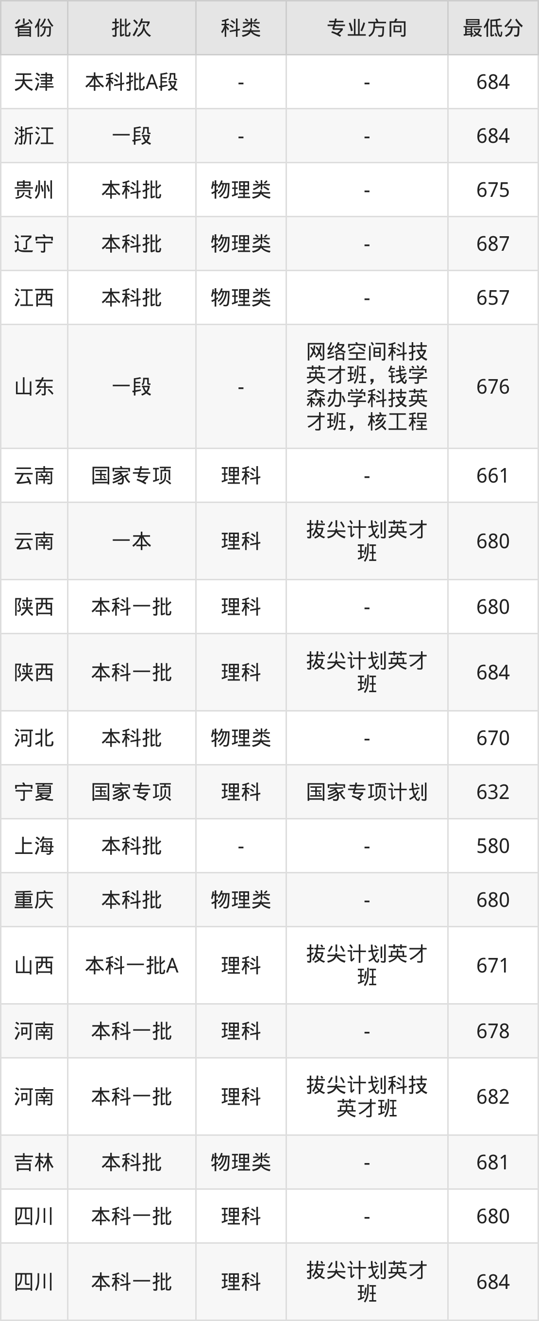 2024年中国科学技术大学工科试验班专业在省外招生分数线各不相同,具体如下: