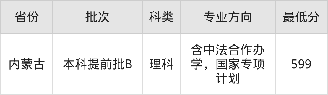 理科599分(含中法合作办学,国家专项计划、位次4323名)。
