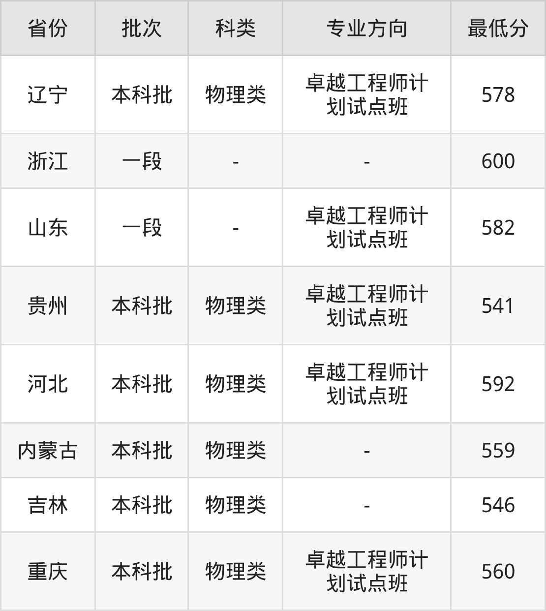 582分(卓越工程师计划试点班、位次40216名);