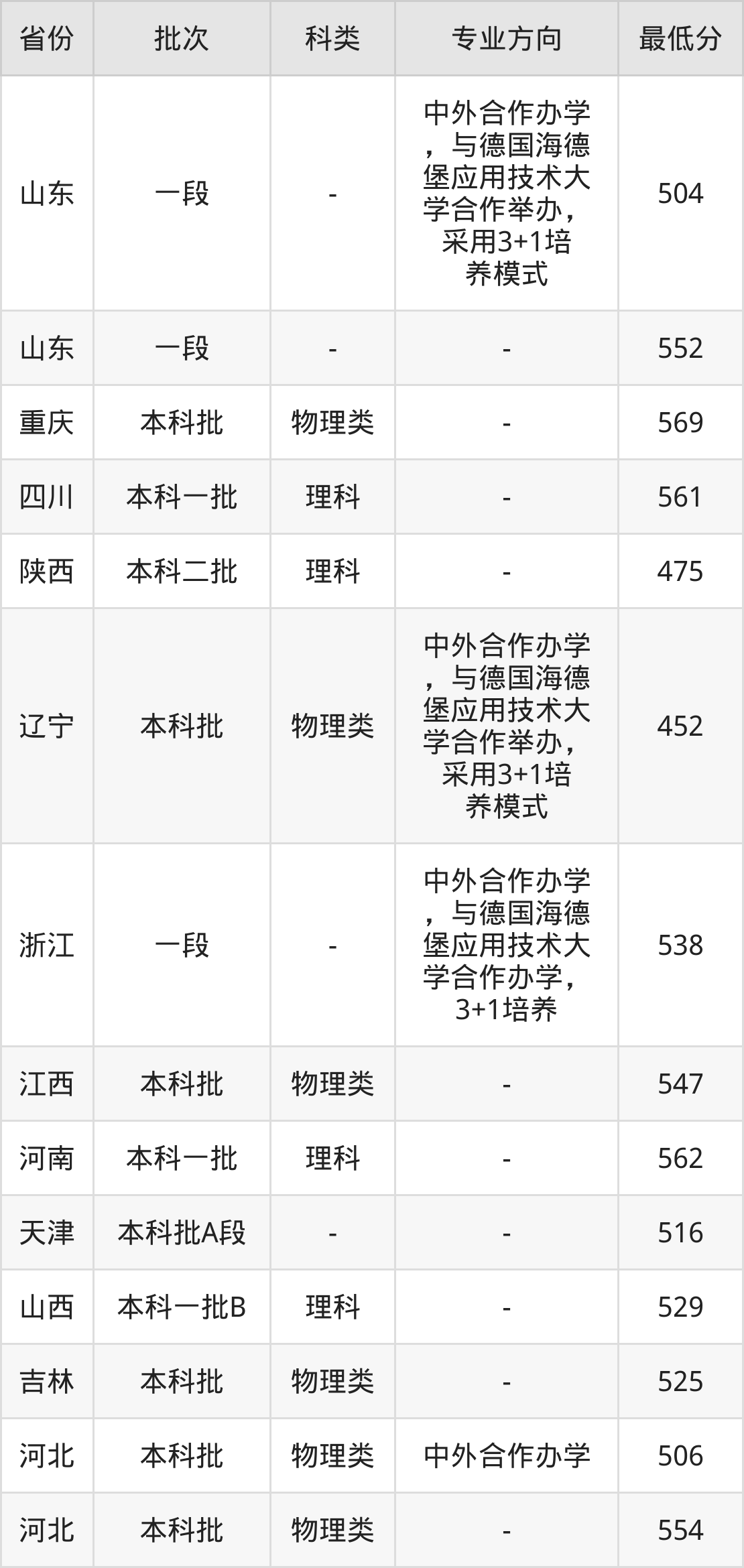 504分(中外合作办学,与德国海德堡应用技术大学合作举办,采用3+1培养模式、位次169405名),552分(位次72300名);