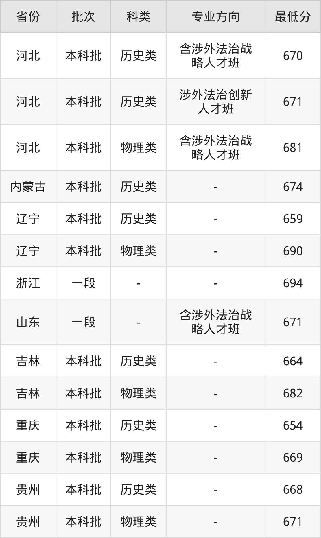 历史类670分(含涉外法治战略人才班、位次50名),历史类671分(涉外法治创新人才班、位次43名),物理类681分(含涉外法治战略人才班、位次233名)。