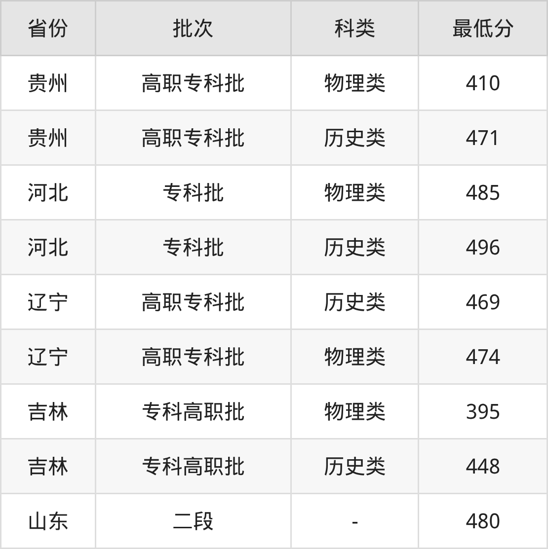 | 批次 | 科类 | 最低分 | 位次 |