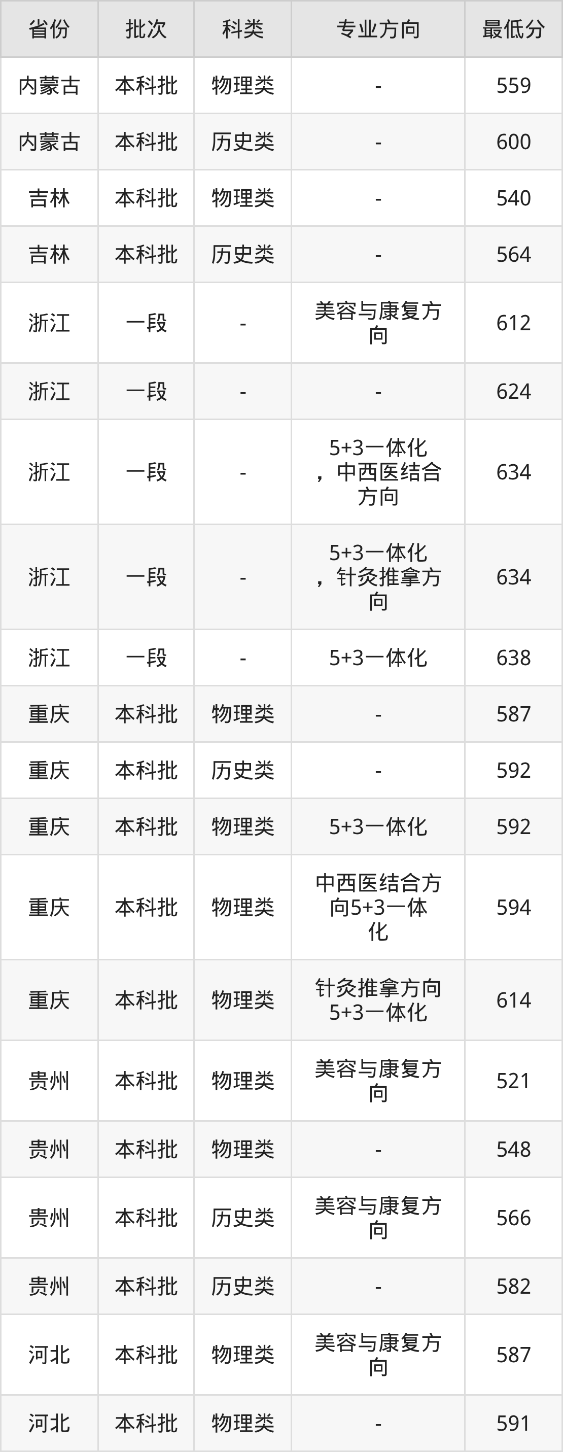 612分(美容与康复方向、位次39544名),624分(位次28320名),634分(5+3一体化,中西医结合方向、位次20417名),634分(5+3一体化,针灸推拿方向、位次20672名),638分(5+3一体化、位次17805名);