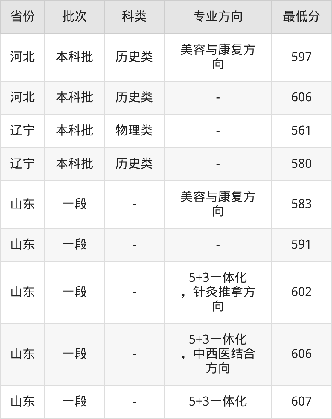 583分(美容与康复方向、位次39442名),591分(位次31932名),602分(5+3一体化,针灸推拿方向、位次23234名),606分(5+3一体化,中西医结合方向、位次20926名),607分(5+3一体化、位次20224名);