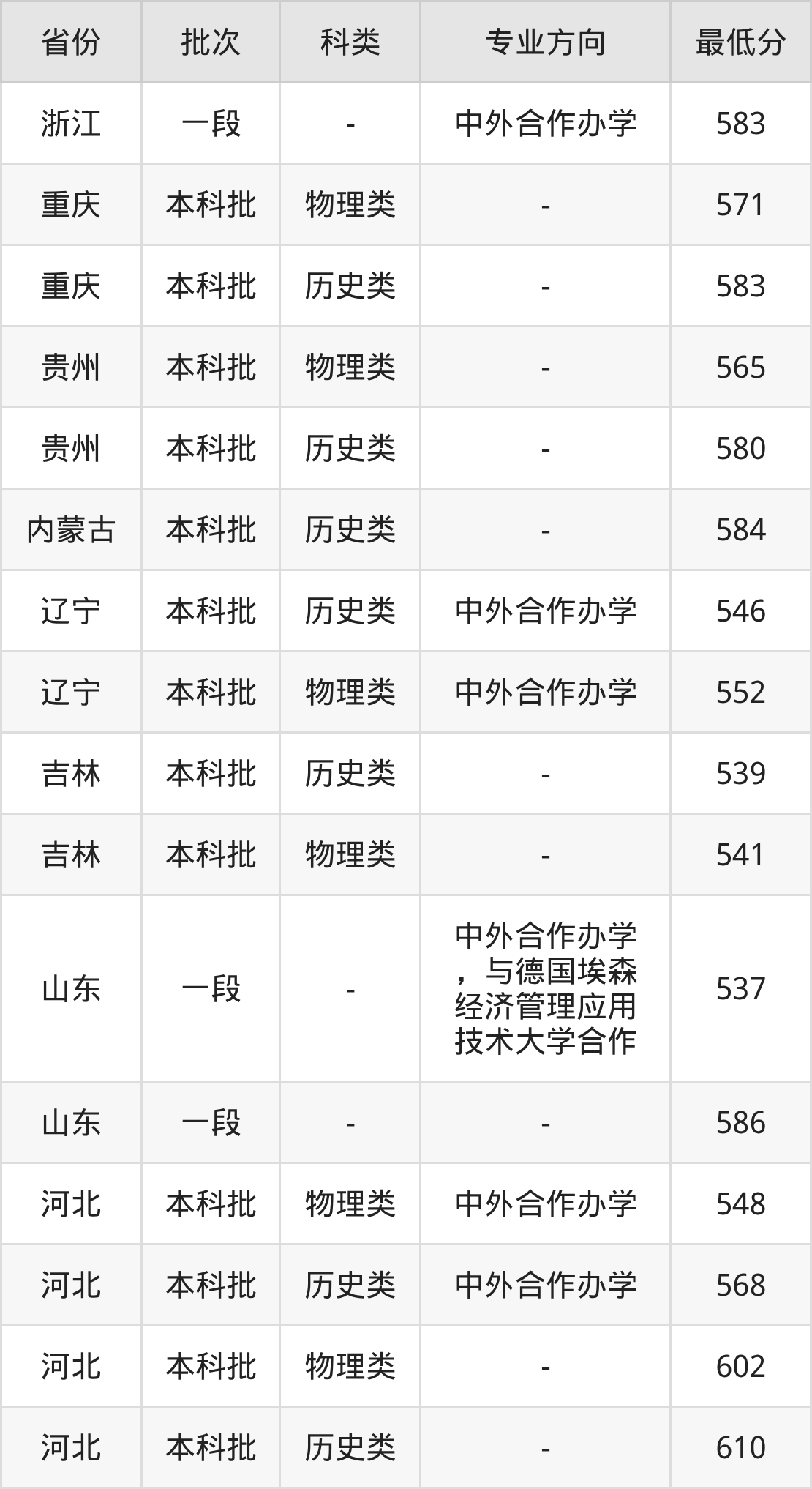 537分(中外合作办学,与德国埃森经济管理应用技术大学合作、位次106002名),586分(位次35936名);