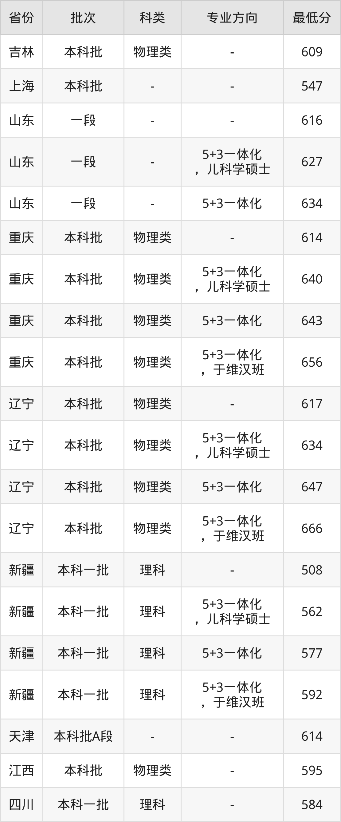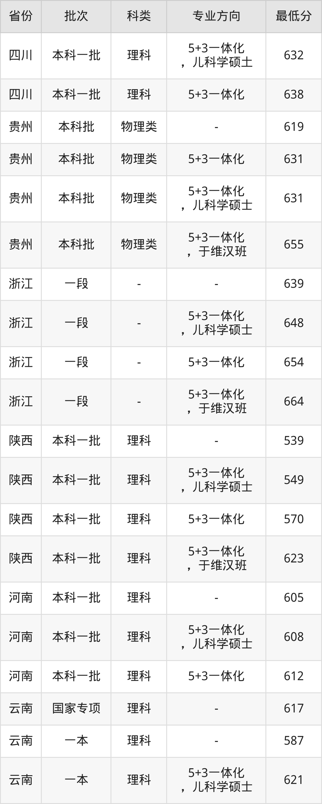 理科617分(位次4341名),理科587分(位次10973名),理科621分(5+3一体化,儿科学硕士、位次3743名),理科623分(5+3一体化、位次3486名),理科644分(5+3一体化,于维汉班、位次1297名)。