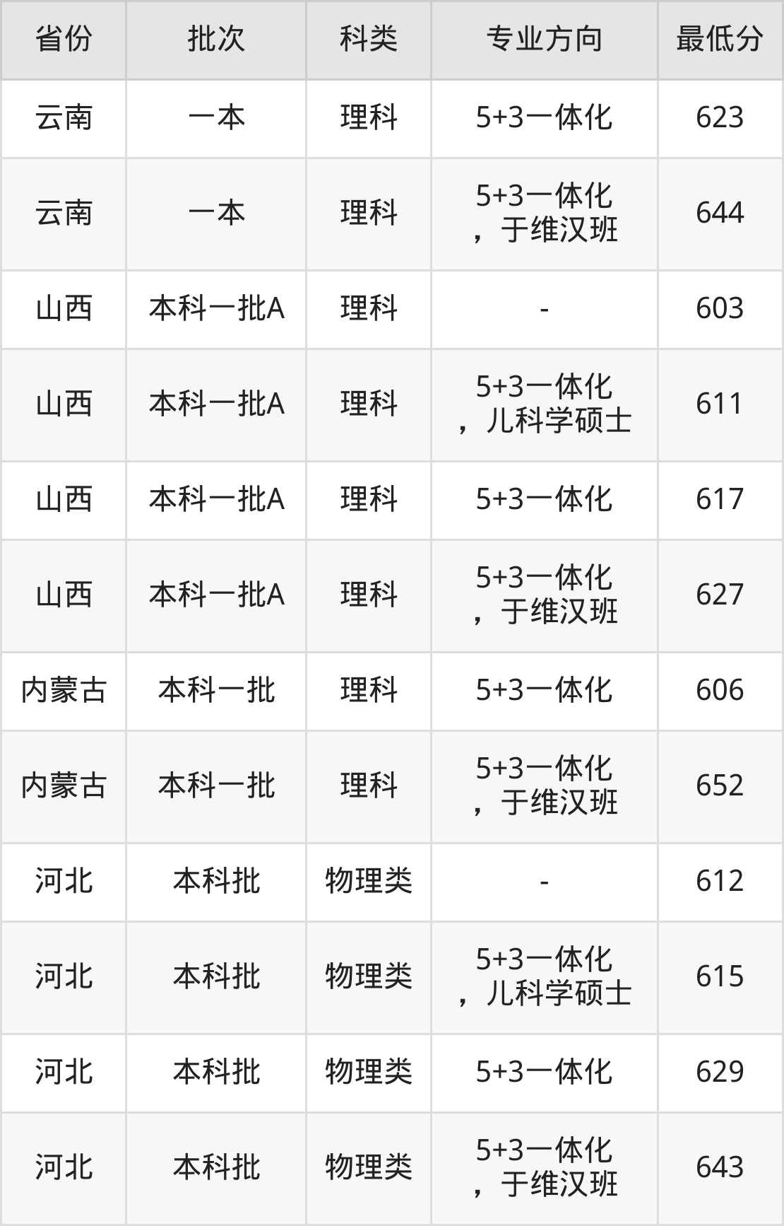 物理类614分(位次9143名),物理类640分(5+3一体化,儿科学硕士、位次3792名),物理类643分(5+3一体化、位次3373名),物理类656分(5+3一体化,于维汉班、位次1836名);