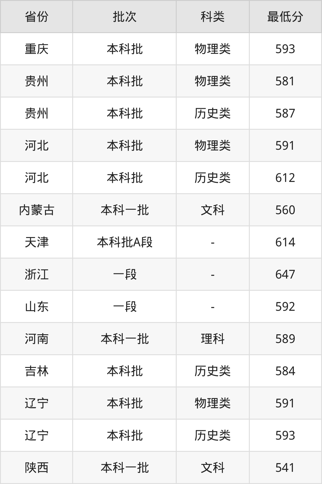 | 批次 | 科类 | 最低分 | 位次 |