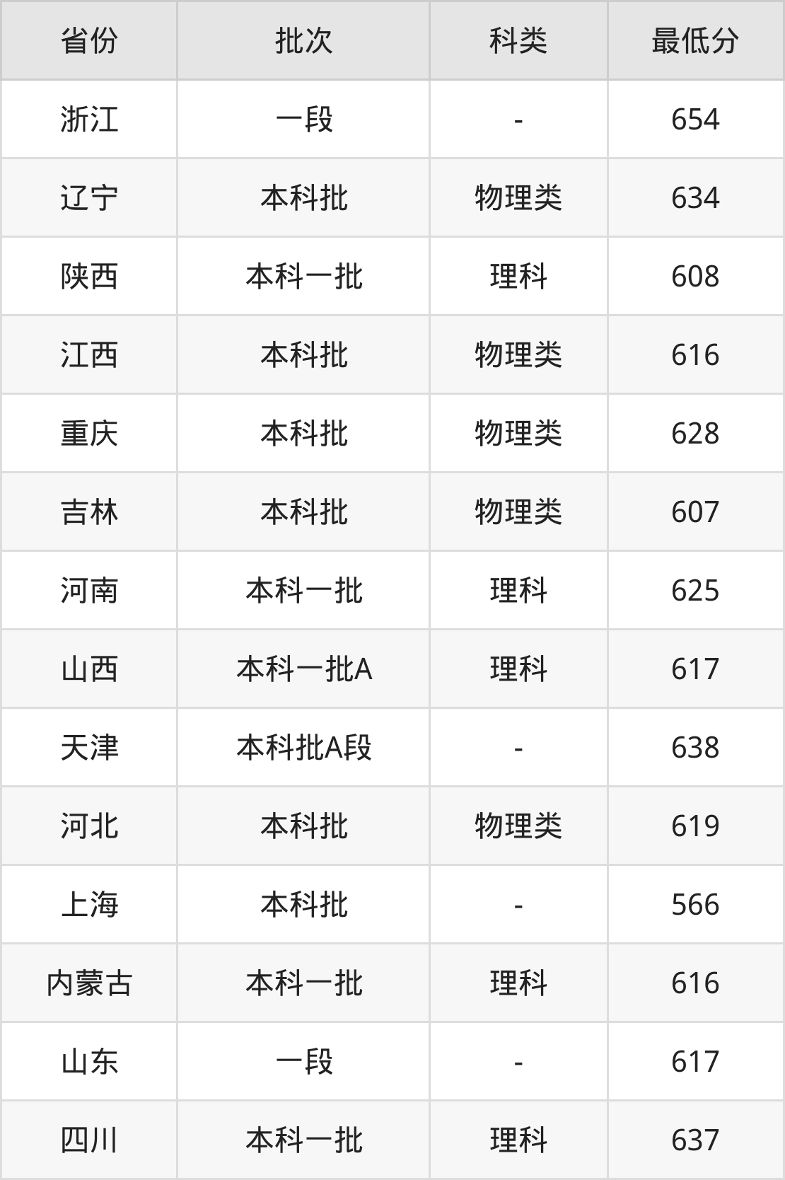 | 批次 | 科类 | 最低分 | 位次 |