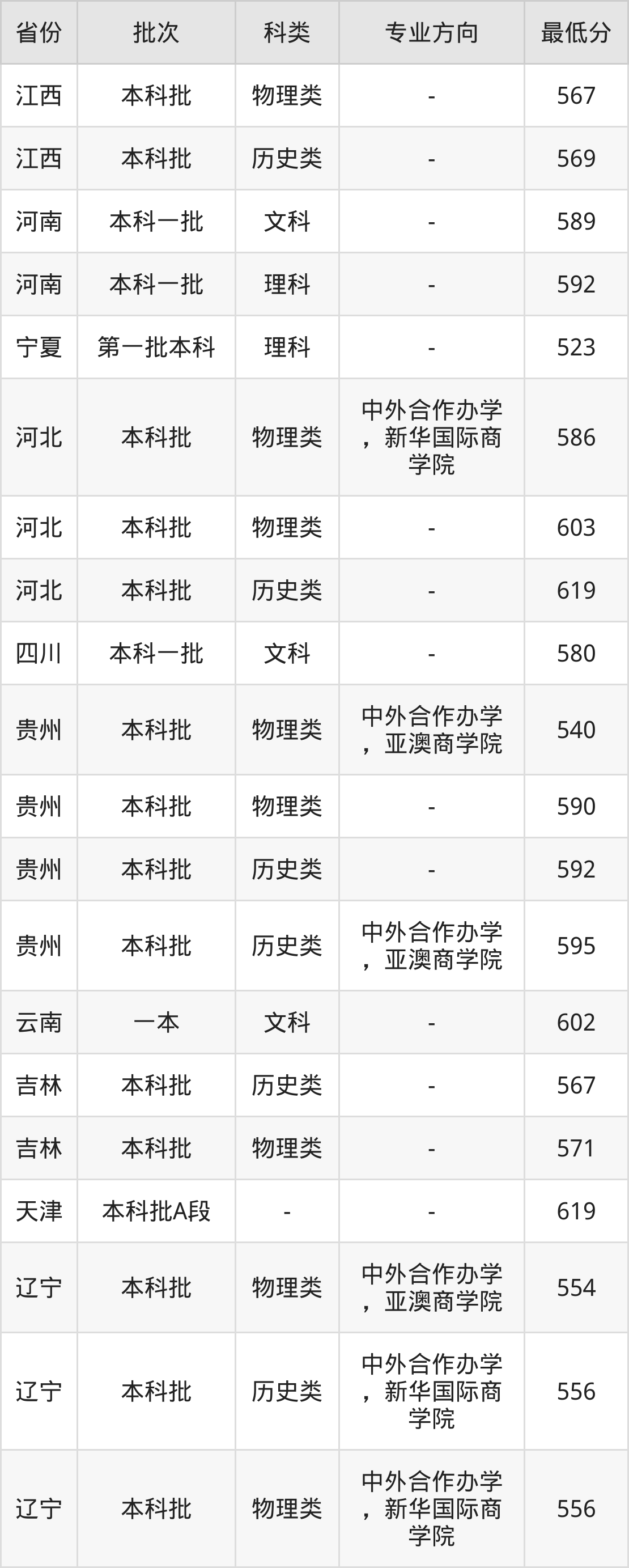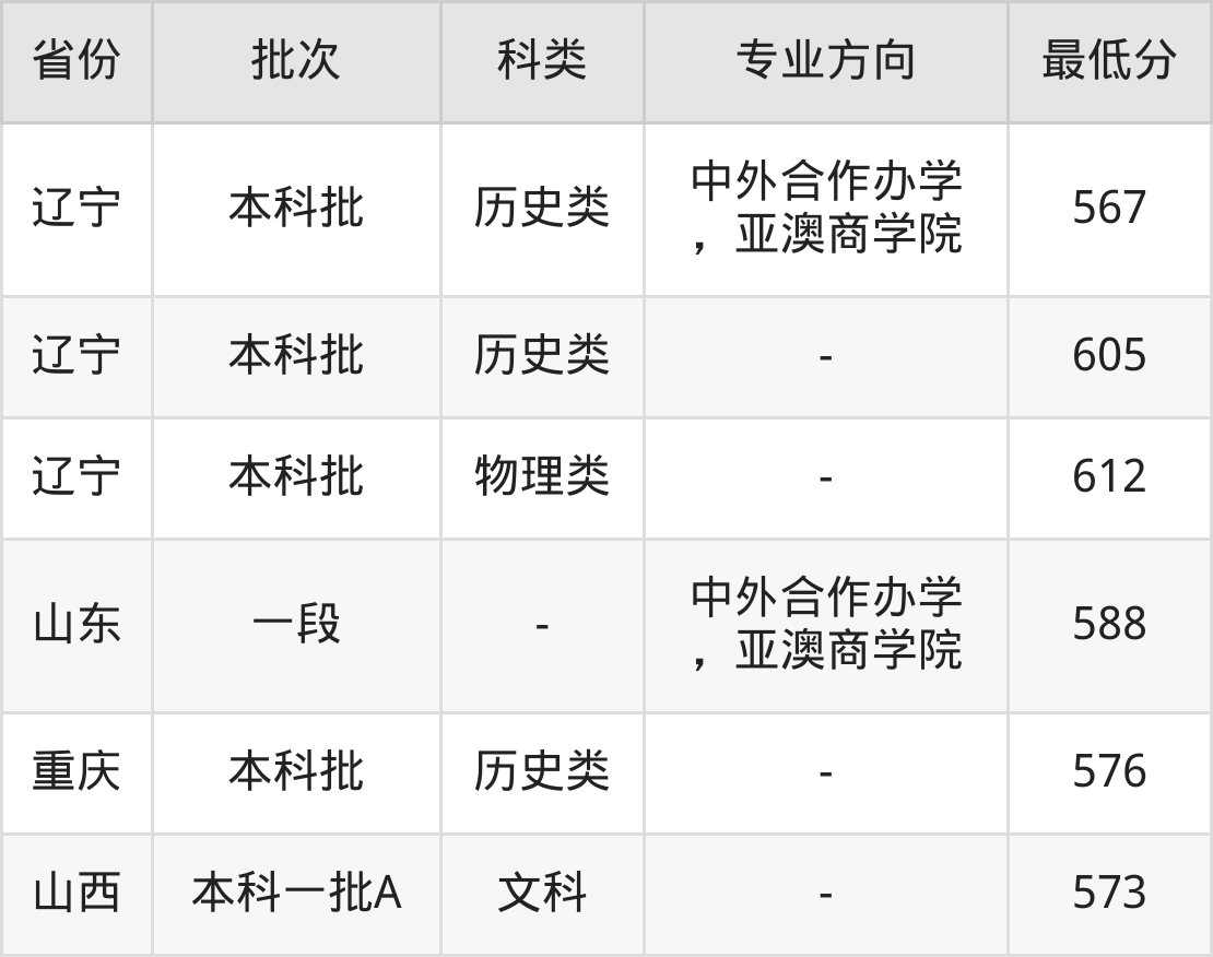 物理类540分(中外合作办学,亚澳商学院、位次29063名),物理类590分(位次11365名),历史类592分(位次2324名),历史类595分(中外合作办学,亚澳商学院、位次2148名);