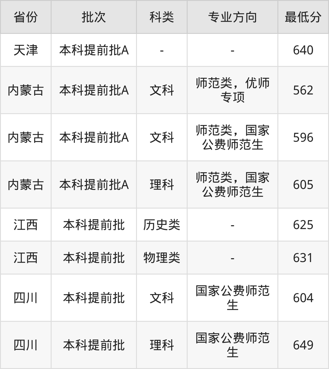 文科562分(师范类,优师专项、位次1192名),文科596分(师范类,国家公费师范生、位次321名),理科605分(师范类,国家公费师范生、位次3734名);