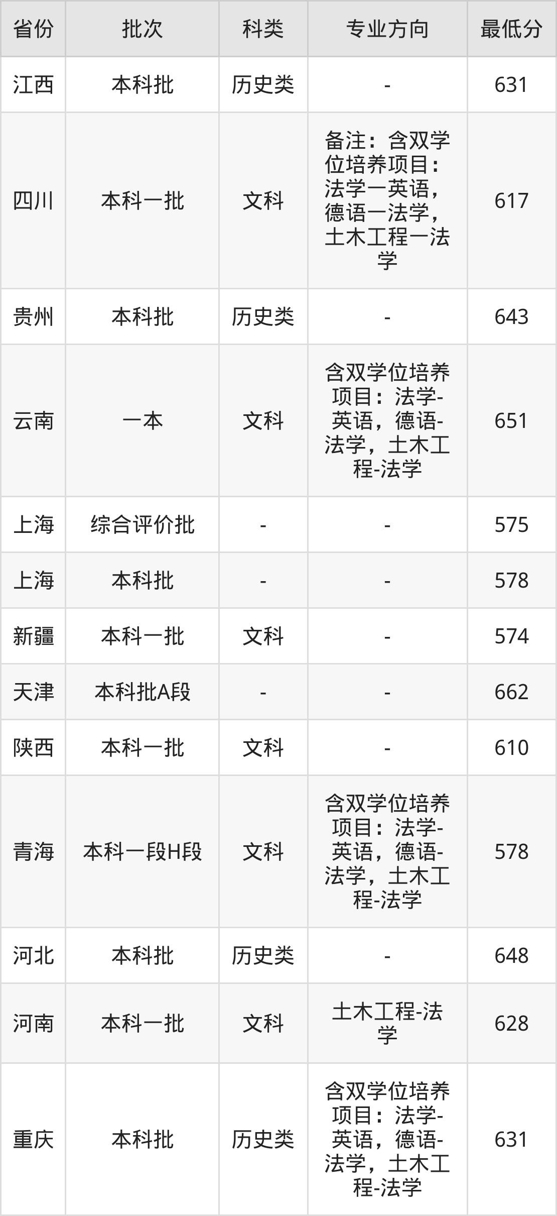文科651分(含双学位培养项目:法学-英语,德语-法学,土木工程-法学、位次191名)。