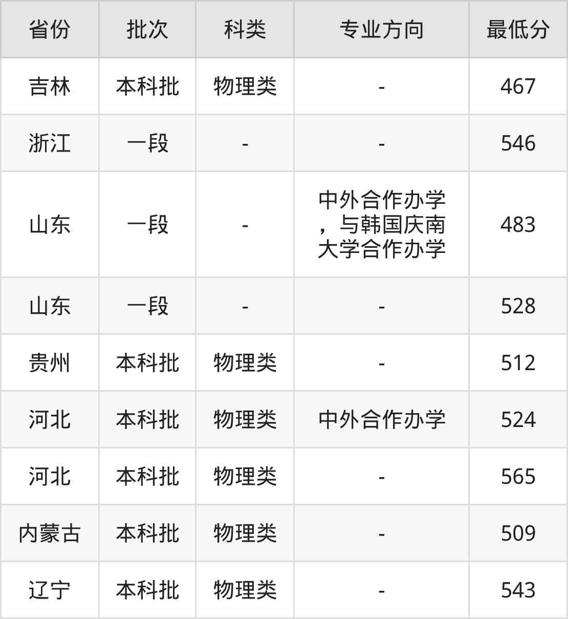483分(中外合作办学,与韩国庆南大学合作办学、位次226664名),528分(位次122809名);