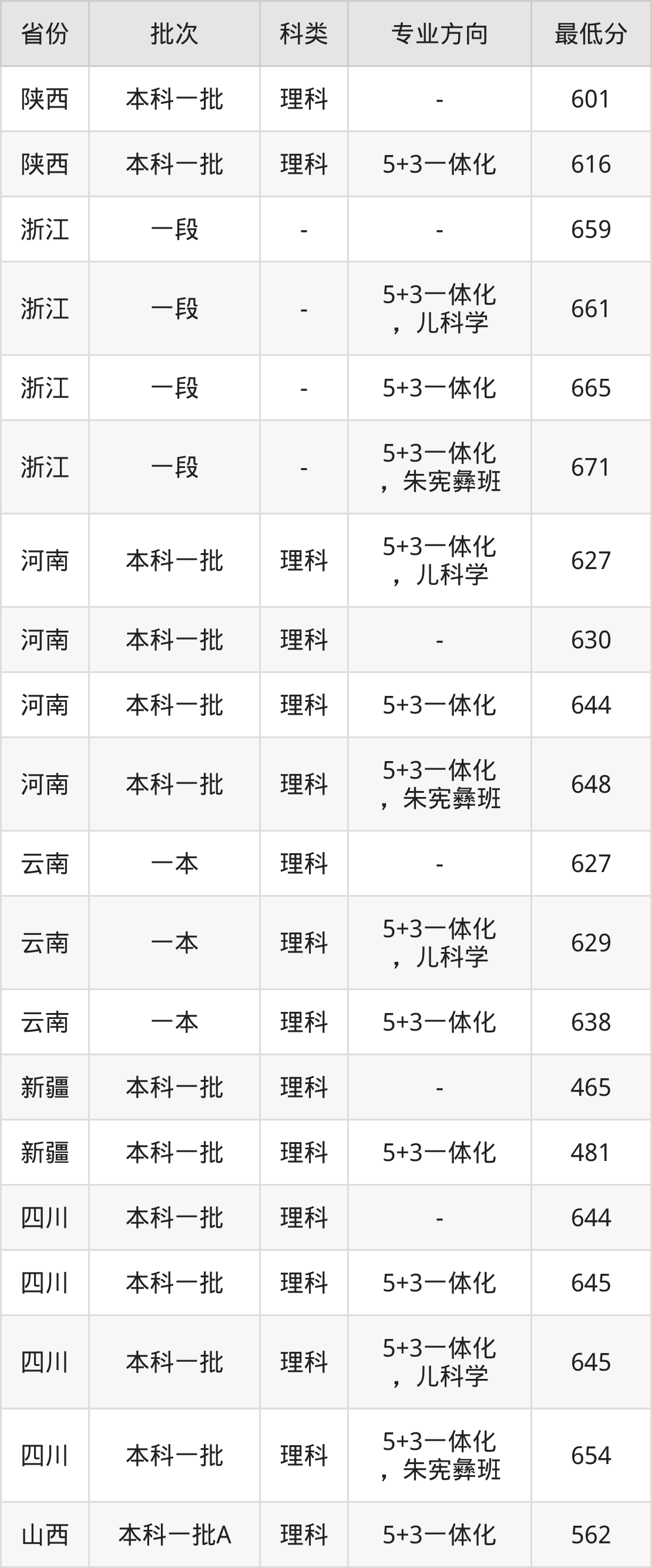 637分(5+3一体化,儿科学、位次6041名),637分(位次6045名),644分(5+3一体化、位次4370名),658分(5+3一体化,朱宪彝班、位次2000名);