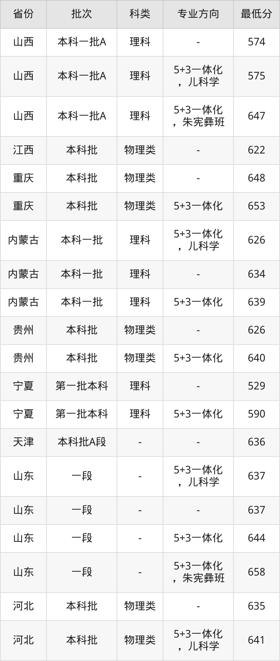 理科626分(5+3一体化,儿科学、位次2027名),理科634分(位次1540名),理科639分(5+3一体化、位次1284名);