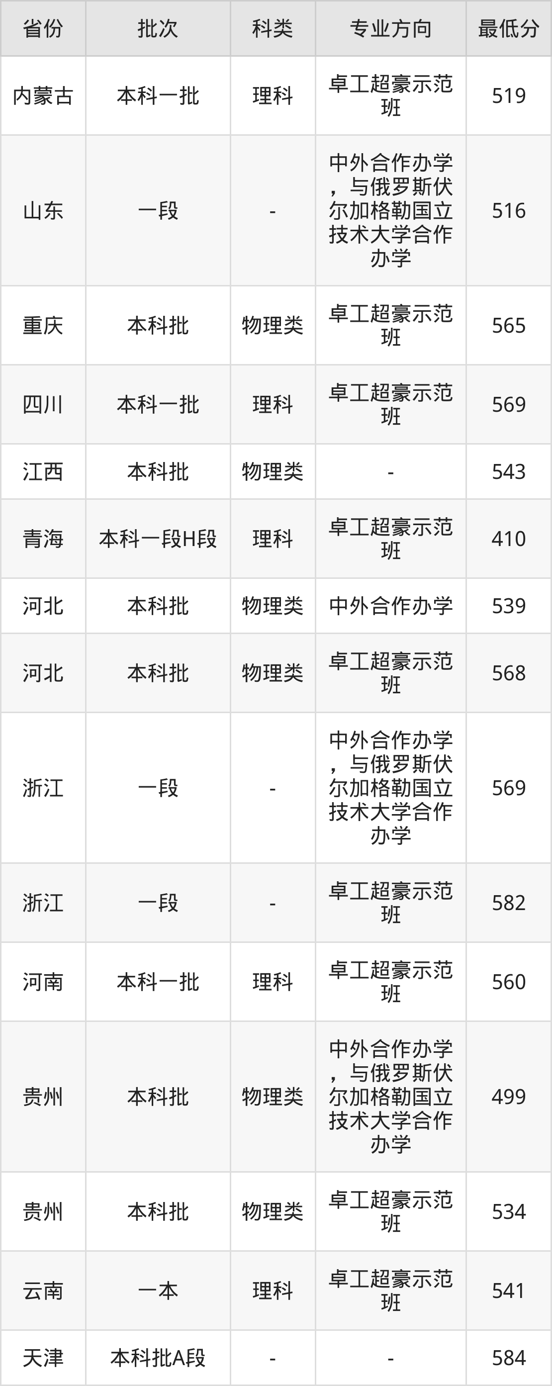 物理类499分(中外合作办学,与俄罗斯伏尔加格勒国立技术大学合作办学、位次52513名),物理类534分(卓工超豪示范班、位次32237名);