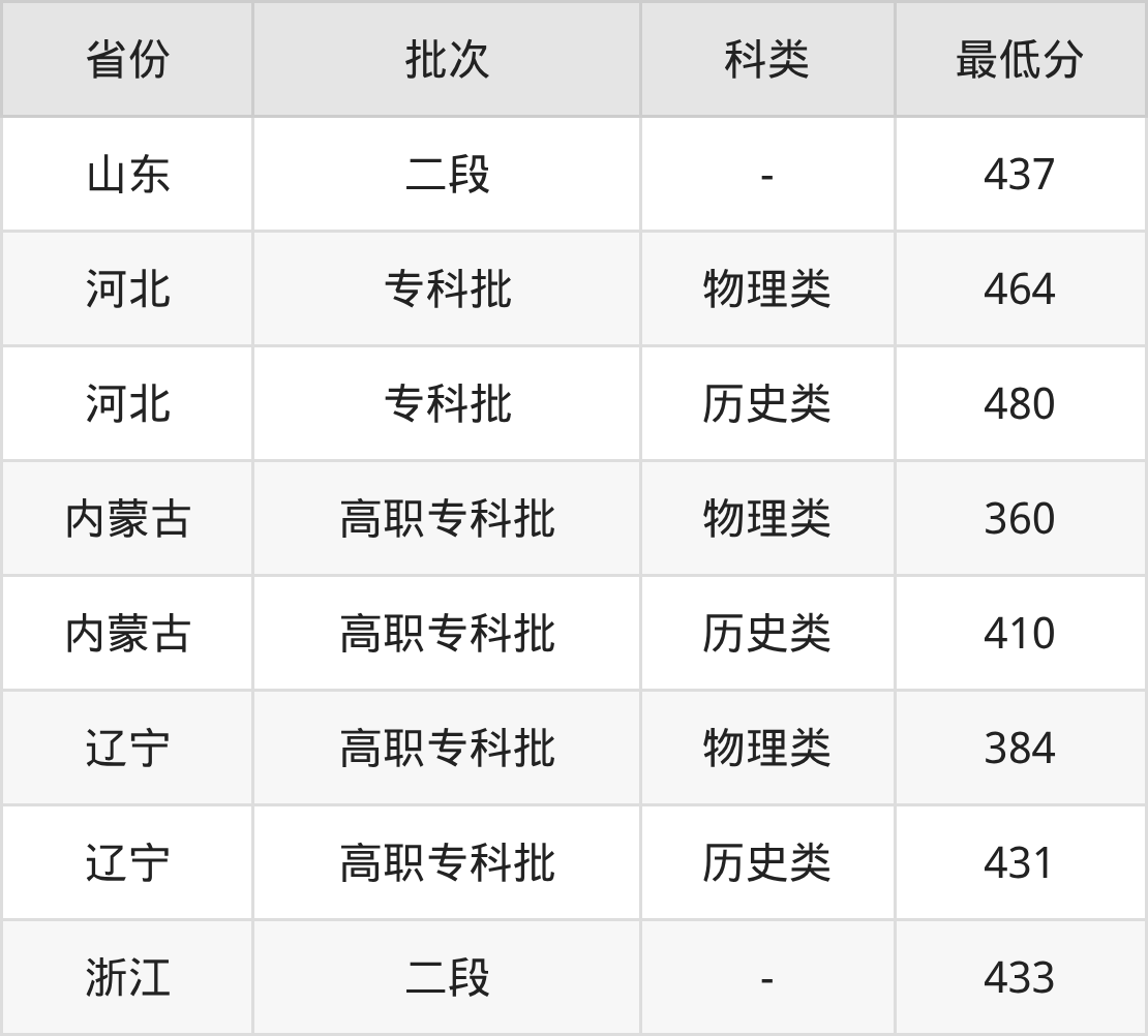 天津现代职业技术学院旅游管理专业录取分数线2025各省汇总显示,市外招生最低分为内蒙古360分、辽宁384分、浙江433分、山东437分等。更多专业分数详情、选科要求、专业简介等均可在正文查阅。