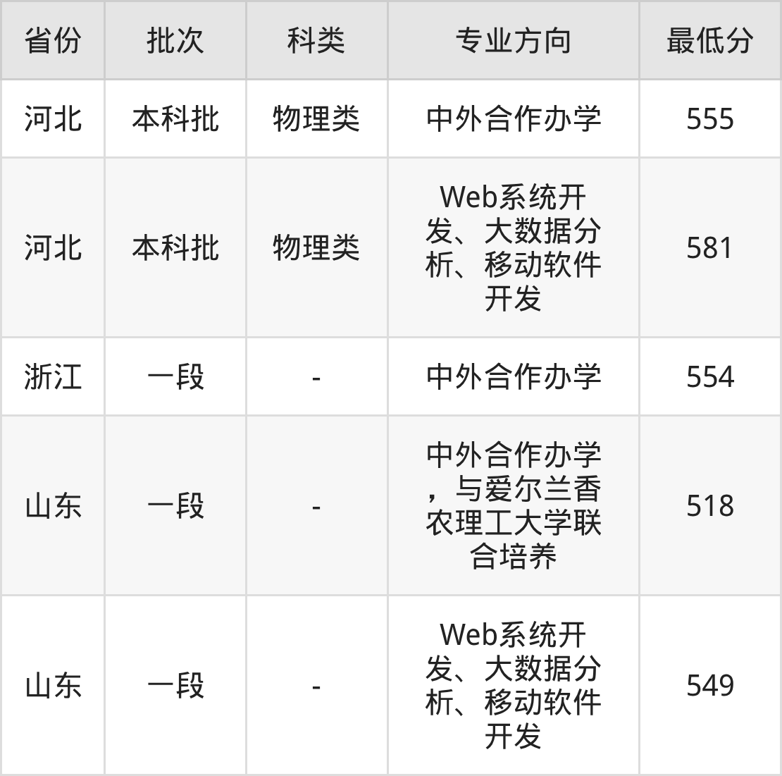 518分(中外合作办学,与爱尔兰香农理工大学联合培养、位次143986名),549分(Web系统开发、大数据分析、移动软件开发、位次83201名);