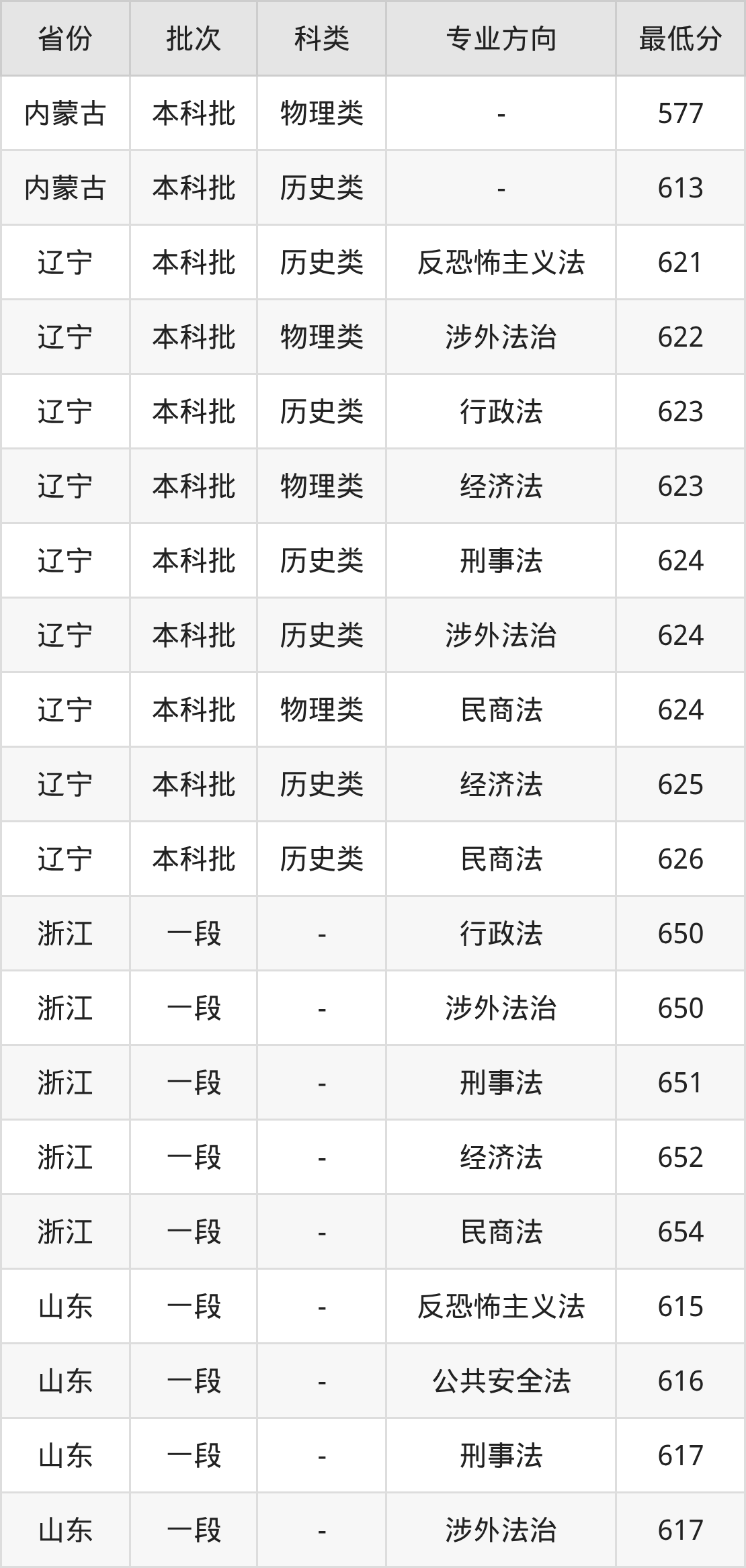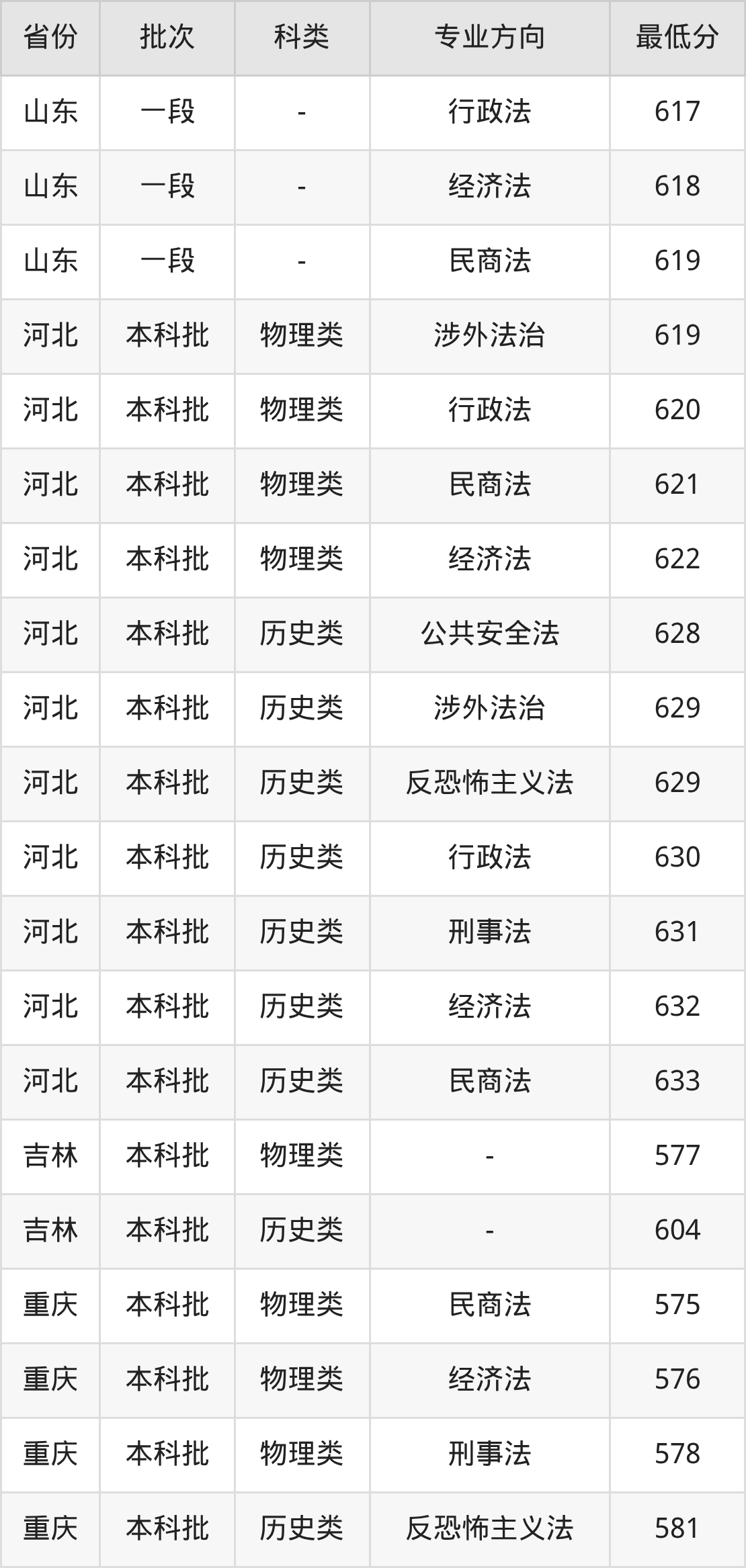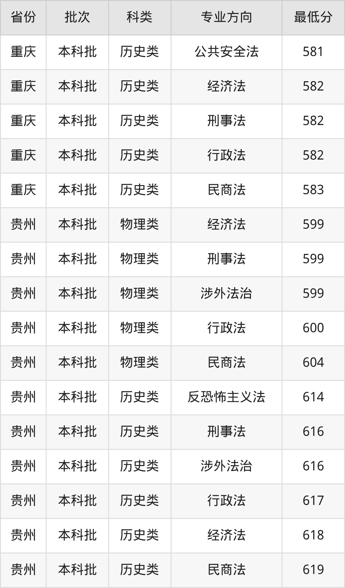 物理类575分(民商法、位次20633名),物理类576分(经济法、位次20247名),物理类578分(刑事法、位次19441名),历史类581分(反恐怖主义法、位次3042名),历史类581分(公共安全法、位次3042名),历史类582分(经济法、位次2943名),历史类582分(刑事法、位次2943名),历史类582分(行政法、位次2943名),历史类583分(民商法、位次2840名)。