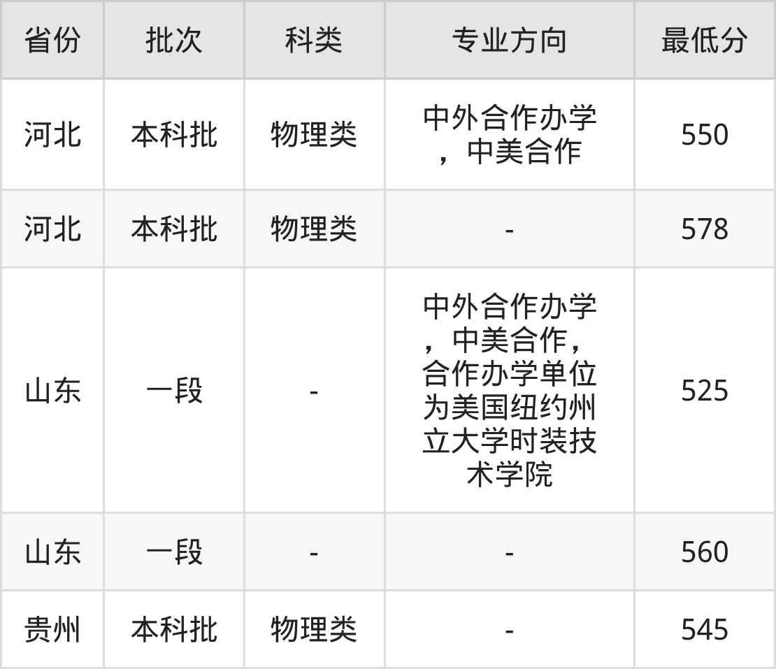 525分(中外合作办学,中美合作,合作办学单位为美国纽约州立大学时装技术学院、位次129391名),560分(位次66624名)。
