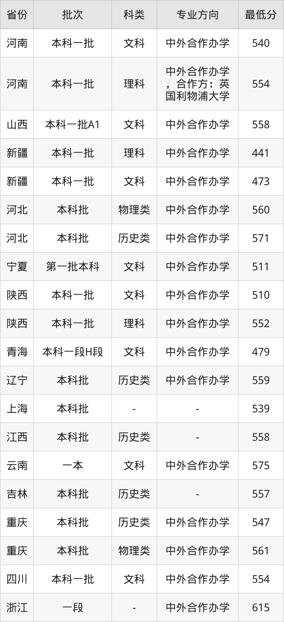 文科540分(中外合作办学、位次16573名),理科554分(中外合作办学,合作方:英国利物浦大学、位次68050名);