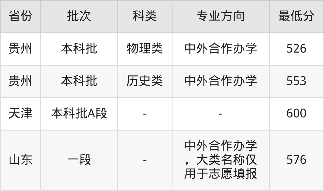 物理类560分(中外合作办学、位次45895名),历史类571分(中外合作办学、位次10021名);