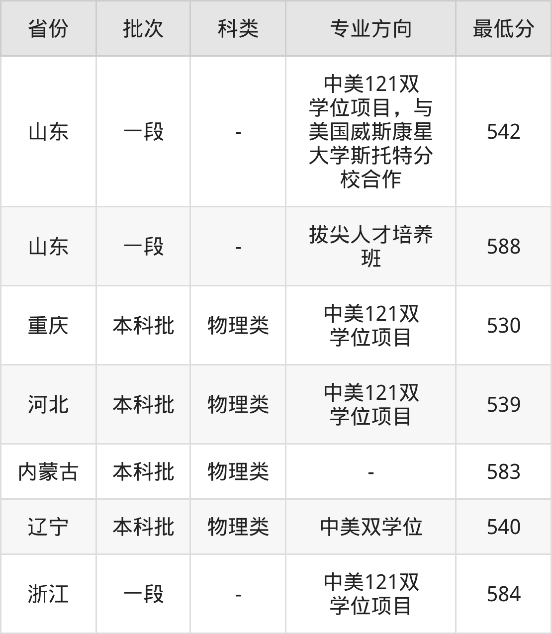 542分(中美121双学位项目,与美国威斯康星大学斯托特分校合作、位次96179名),588分(拔尖人才培养班、位次34322名);